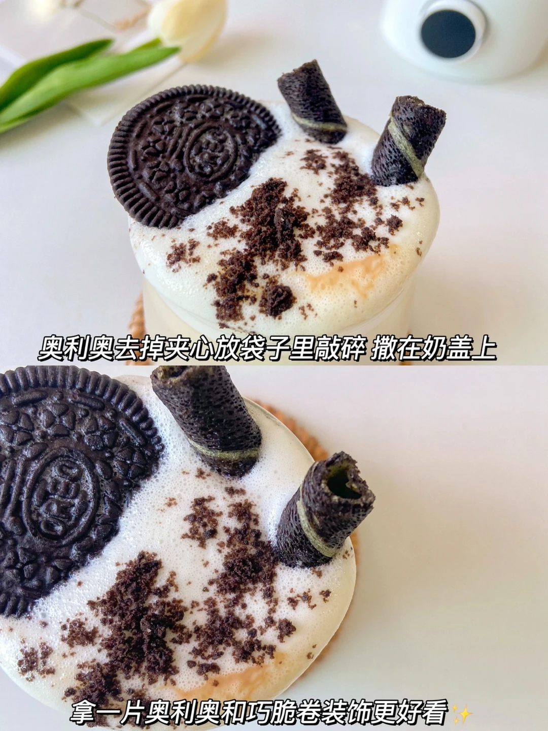 5️⃣把奶盖倒在奶茶上 奥利奥去掉夹心放袋子里敲碎 撒在奶盖上 拿一片奥利奥和巧脆卷装饰更好看👀