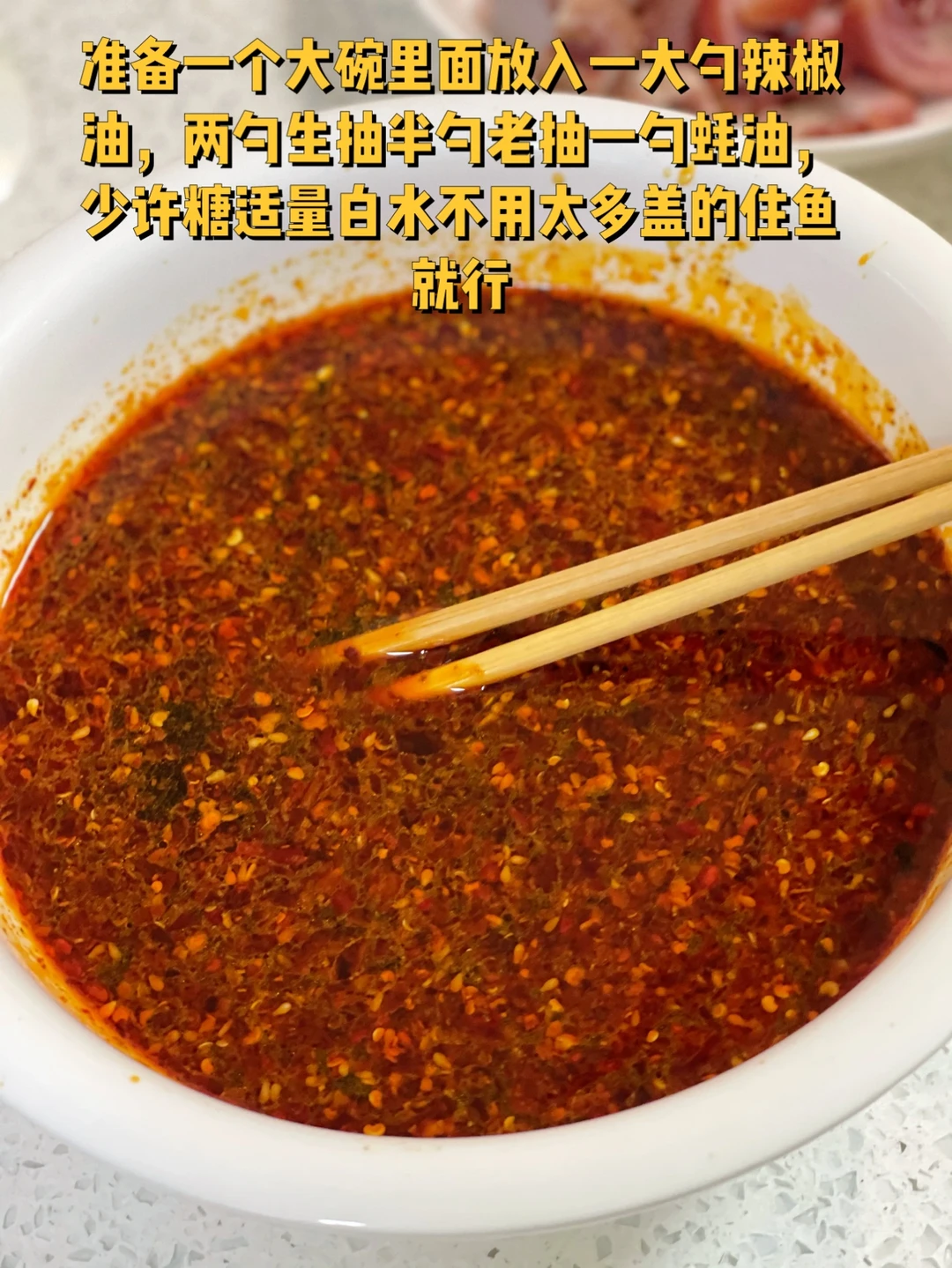 5. 准备一个大碗里面放入一大勺辣椒油,两勺生抽半勺老抽一勺蚝油,少许糖适量白水不用太多盖的住鱼就行