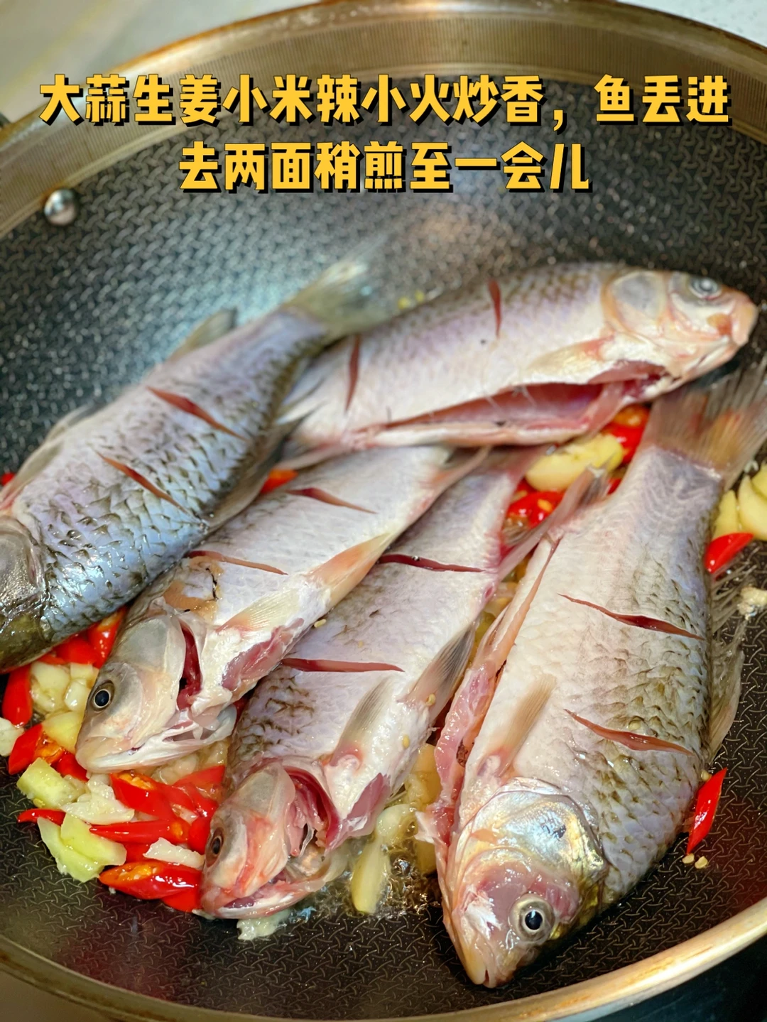 6. 大蒜生姜小米辣小火炒香,鱼丢进去两面稍煎至一会儿