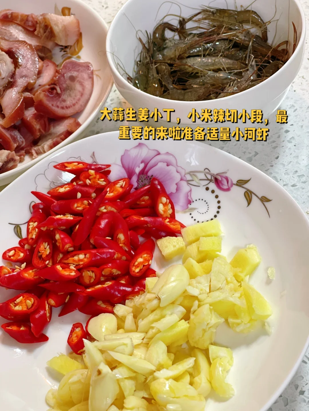 4 大蒜生姜小丁,小米辣切小段,最重要的来啦准备适量小河虾