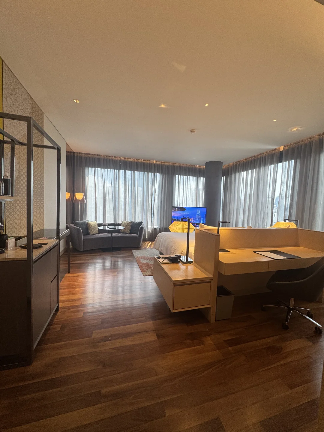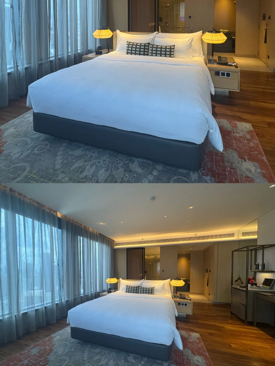房间很大很干净,采光也很好;床品很舒适,住的这几天睡的都很好;卫生间里有浴缸🛁,晚上可以一边泡澡一边欣赏窗外的双子塔;