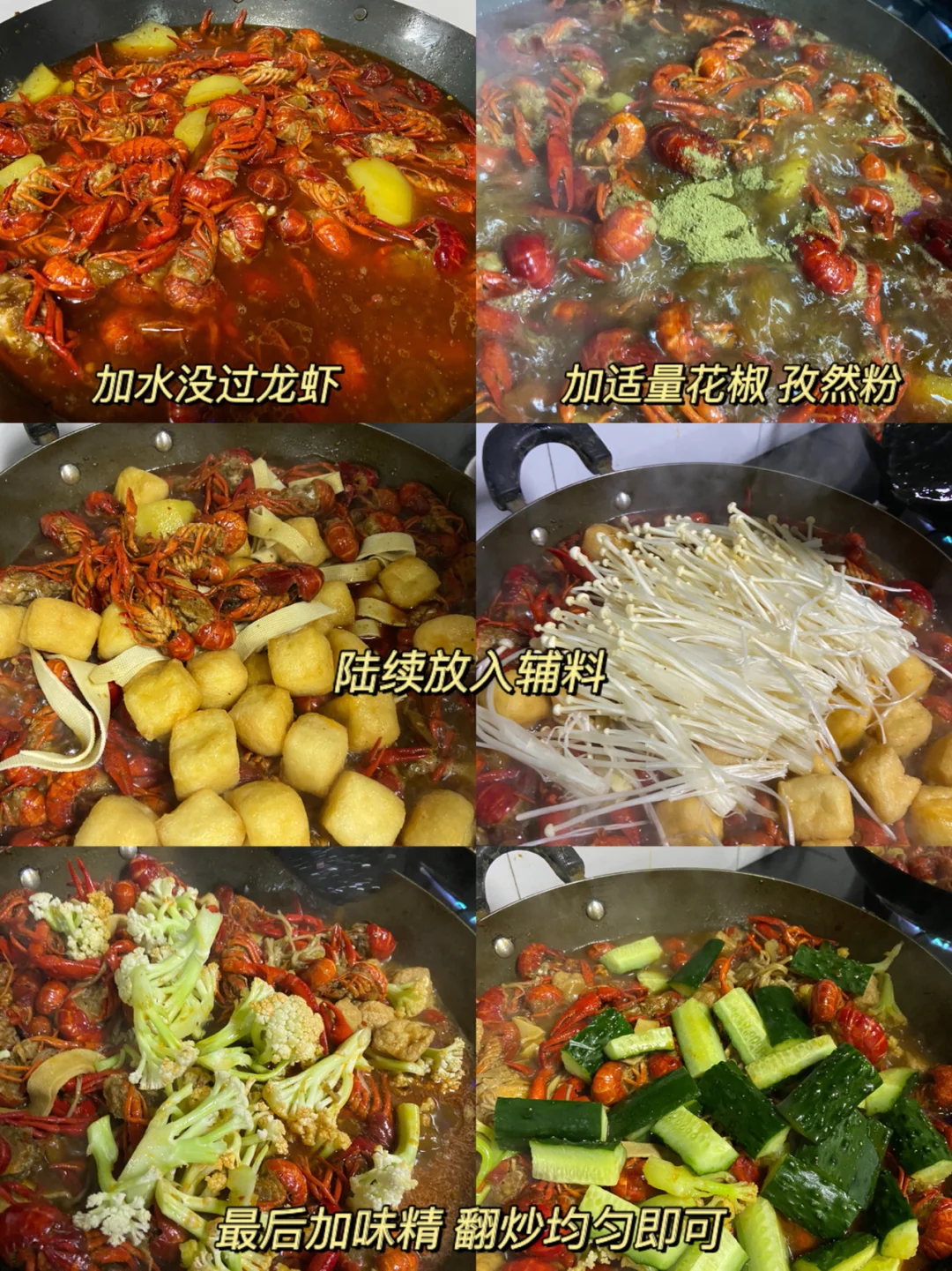 4️⃣加入小龙虾翻炒 加料酒 蚝油 翻炒均匀 加红糖 盐翻炒均匀 加水没过龙虾 加花椒孜然(水开尝一下味道 按照个人的喜好调整)