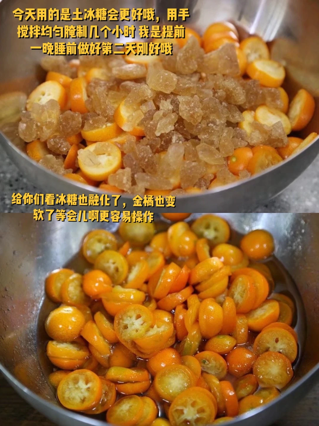4.去干净籽的金橘放入一个大一点的容器里,今天用的是土冰糖会更好哦,用手搅拌均匀腌制几个小时 我是提前一晚睡前做好第二天刚好哦