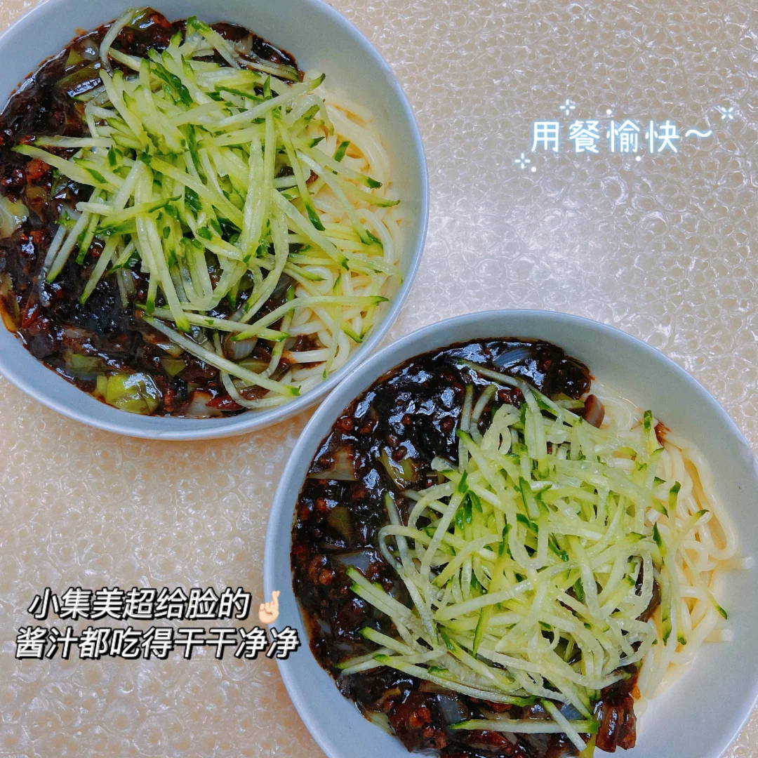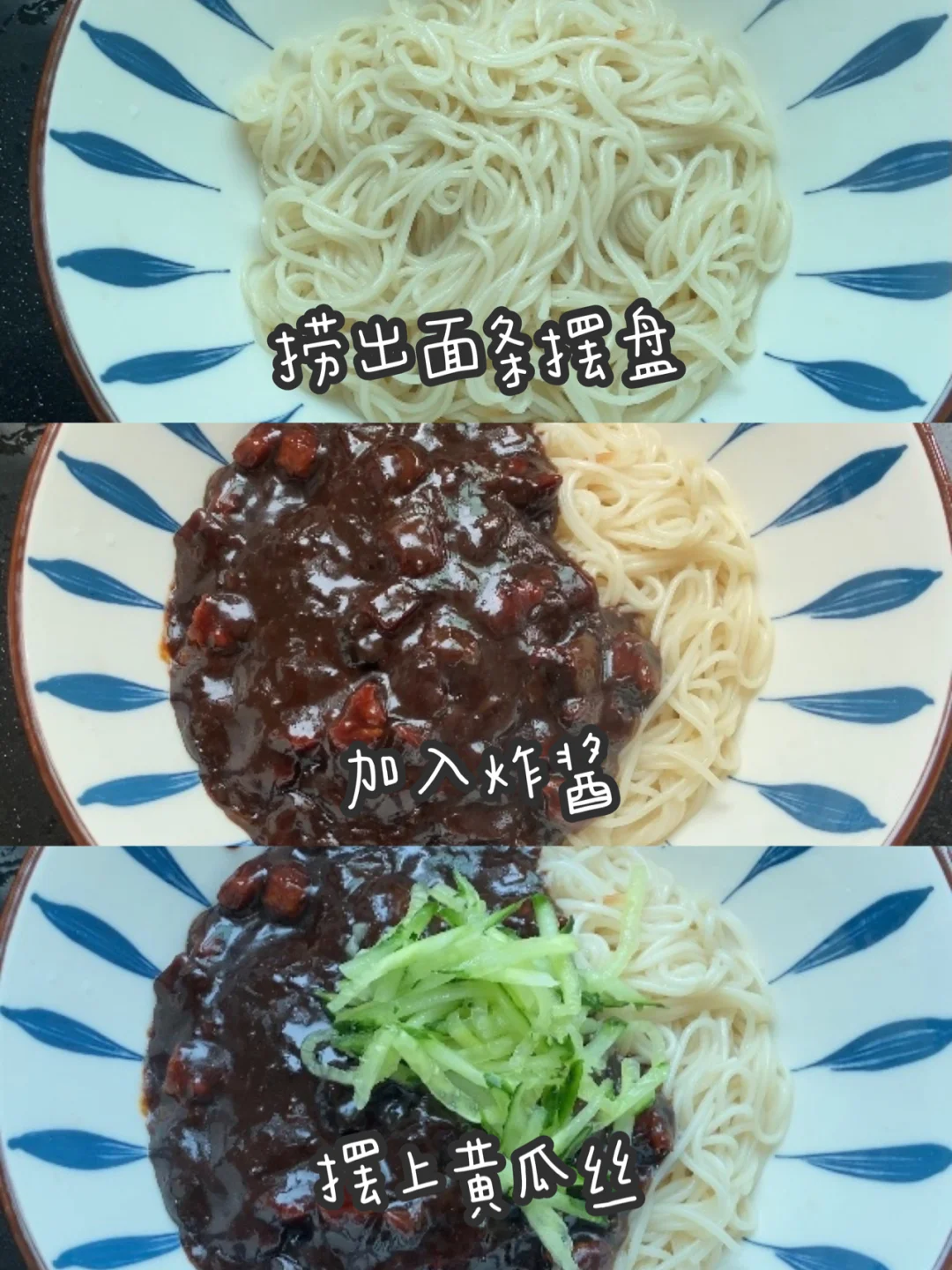 5️⃣面条煮熟冷水冲洗沥干 加入炸酱 黄瓜丝 即可✔️