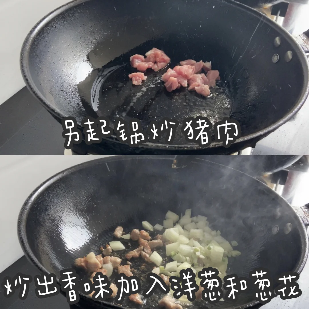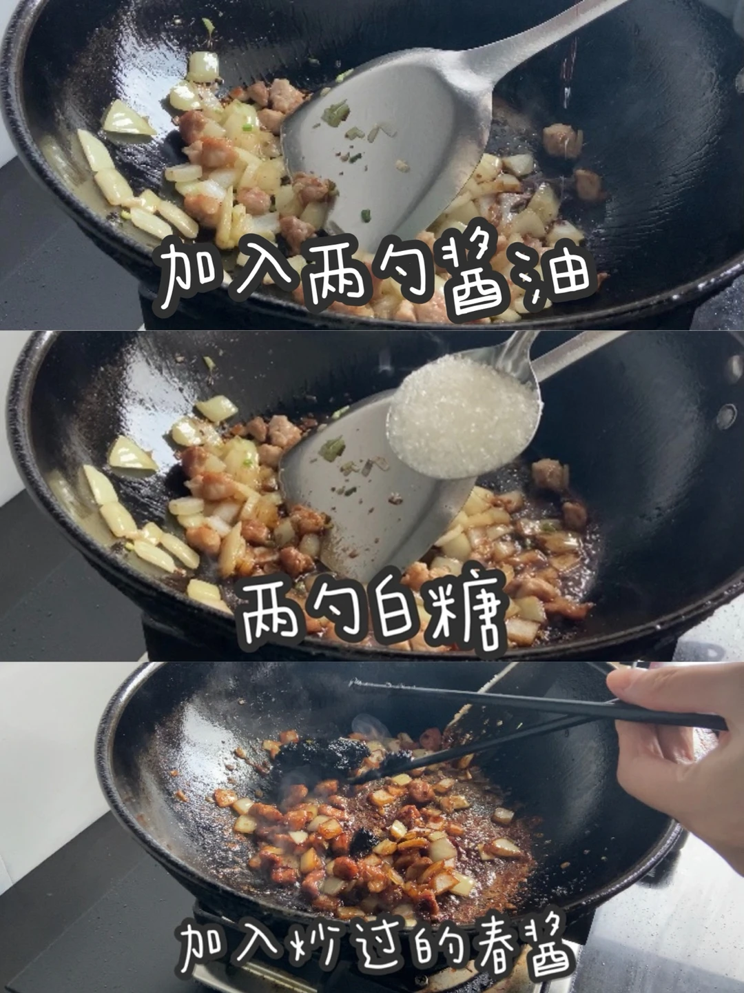 2️⃣猪肉选用猪后腿肉 五花肉都可以 猪肉先下锅煸炒出香味后加入部分洋葱和葱花焙岀香味 之后加入酱油2勺 白糖2勺