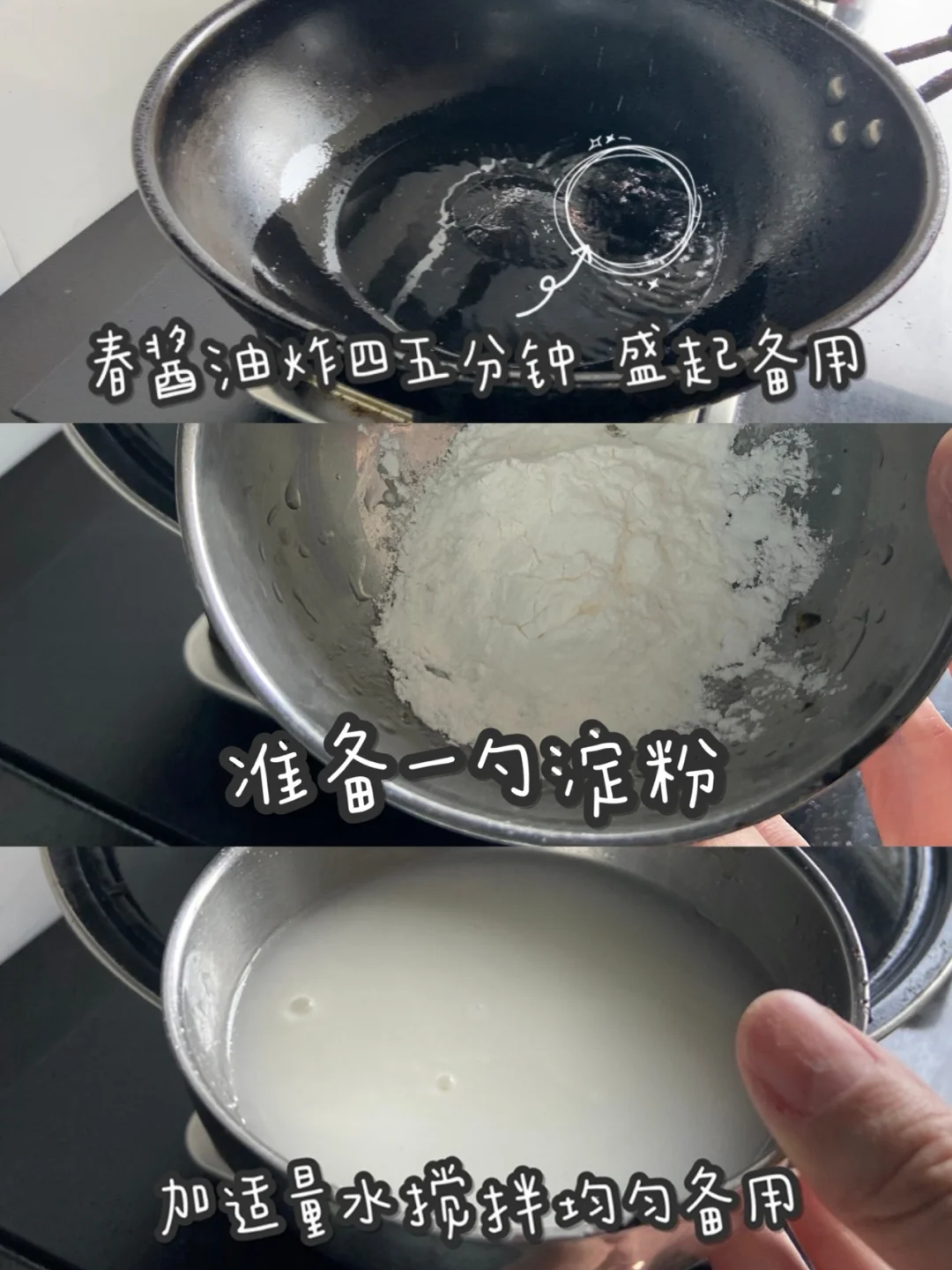 1️⃣春酱提前食用油油炸四五分钟后 盛起待用