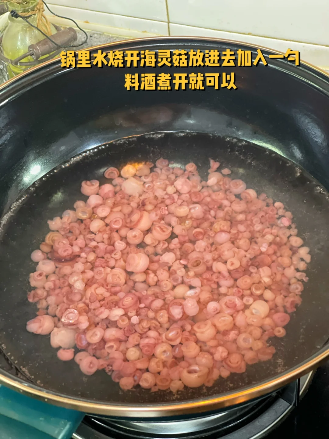 2. 锅里水烧开海灵菇放进去加入一勺料酒煮开就可以