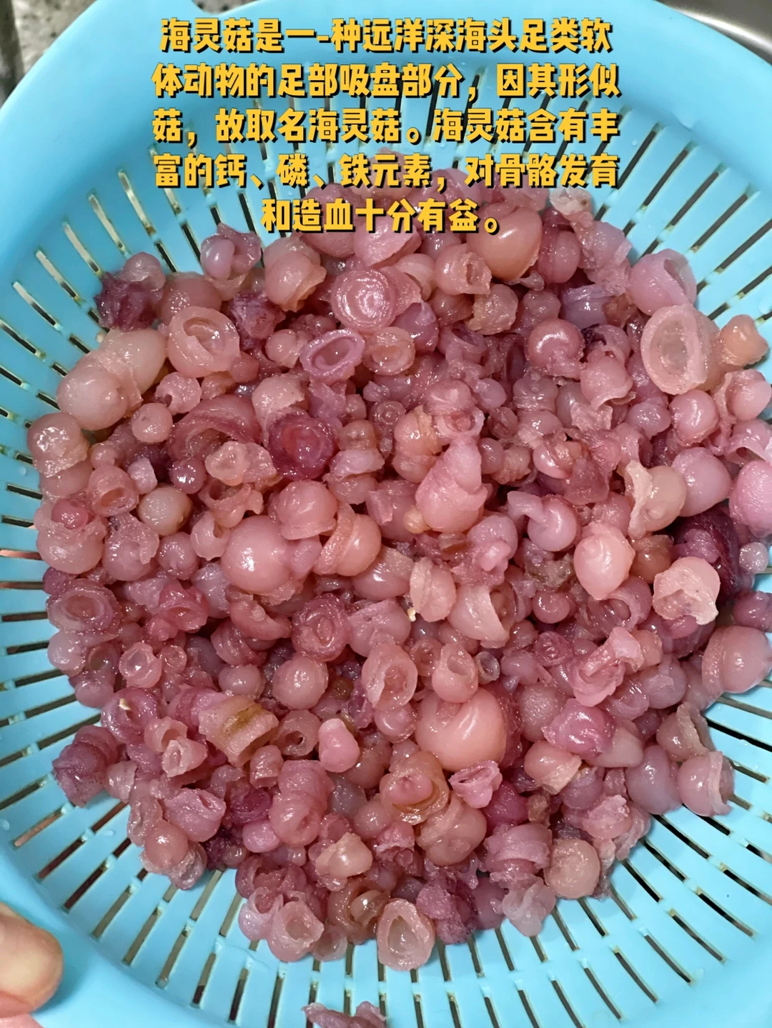 1. 海灵菇是一-种远洋深海头足类软体动物的足部吸盘部分,因其形似菇,故取名海灵菇。海灵菇含有丰富的钙、磷、铁元素,对骨骼发育和造血十分有益。