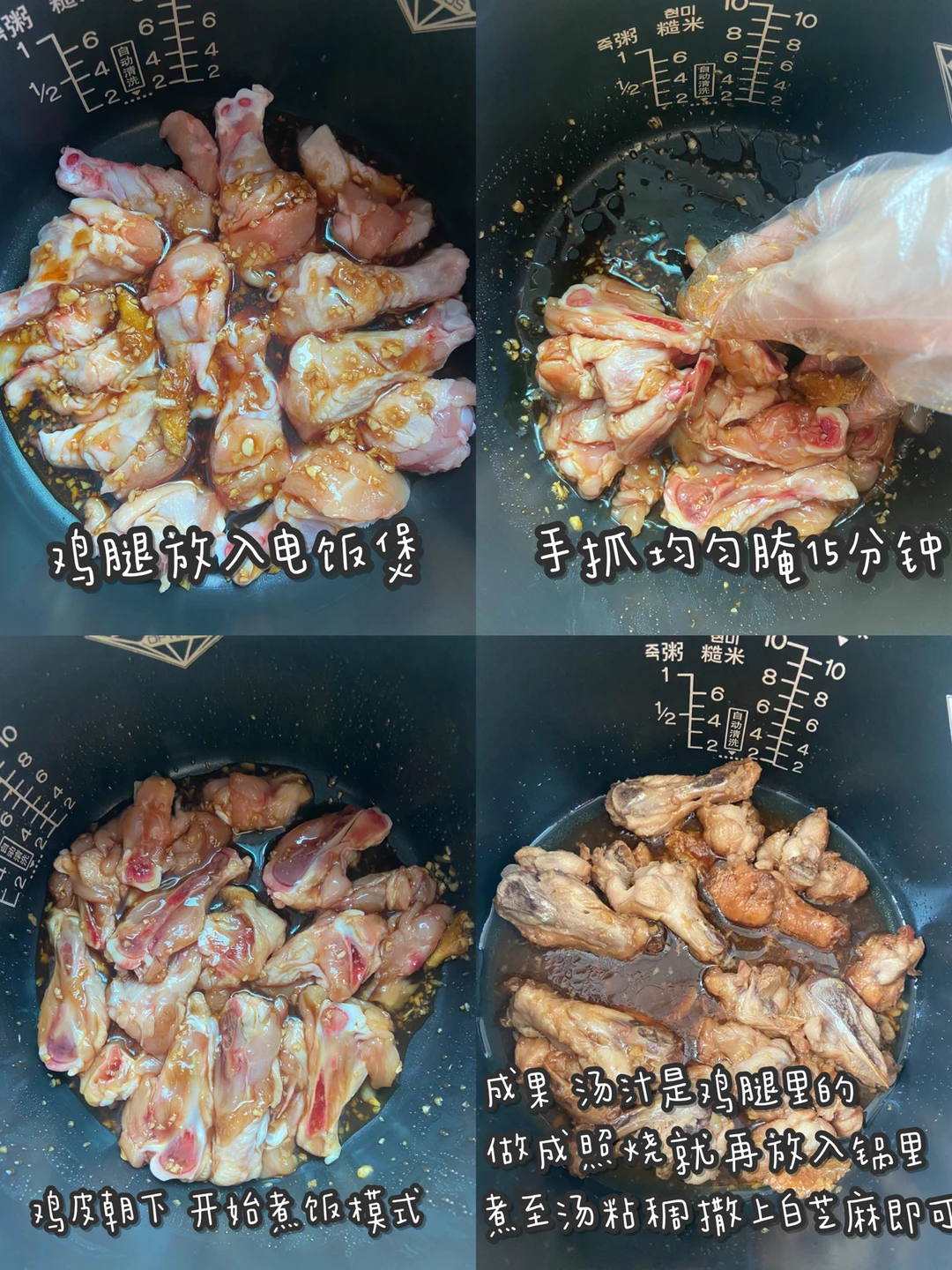 1️⃣小鸡腿改刀 蒜瓣切碎 所有的调料都放电饭煲锅里 小鸡腿放进去 抓揉一下鸡翅根 腌一下会更入味