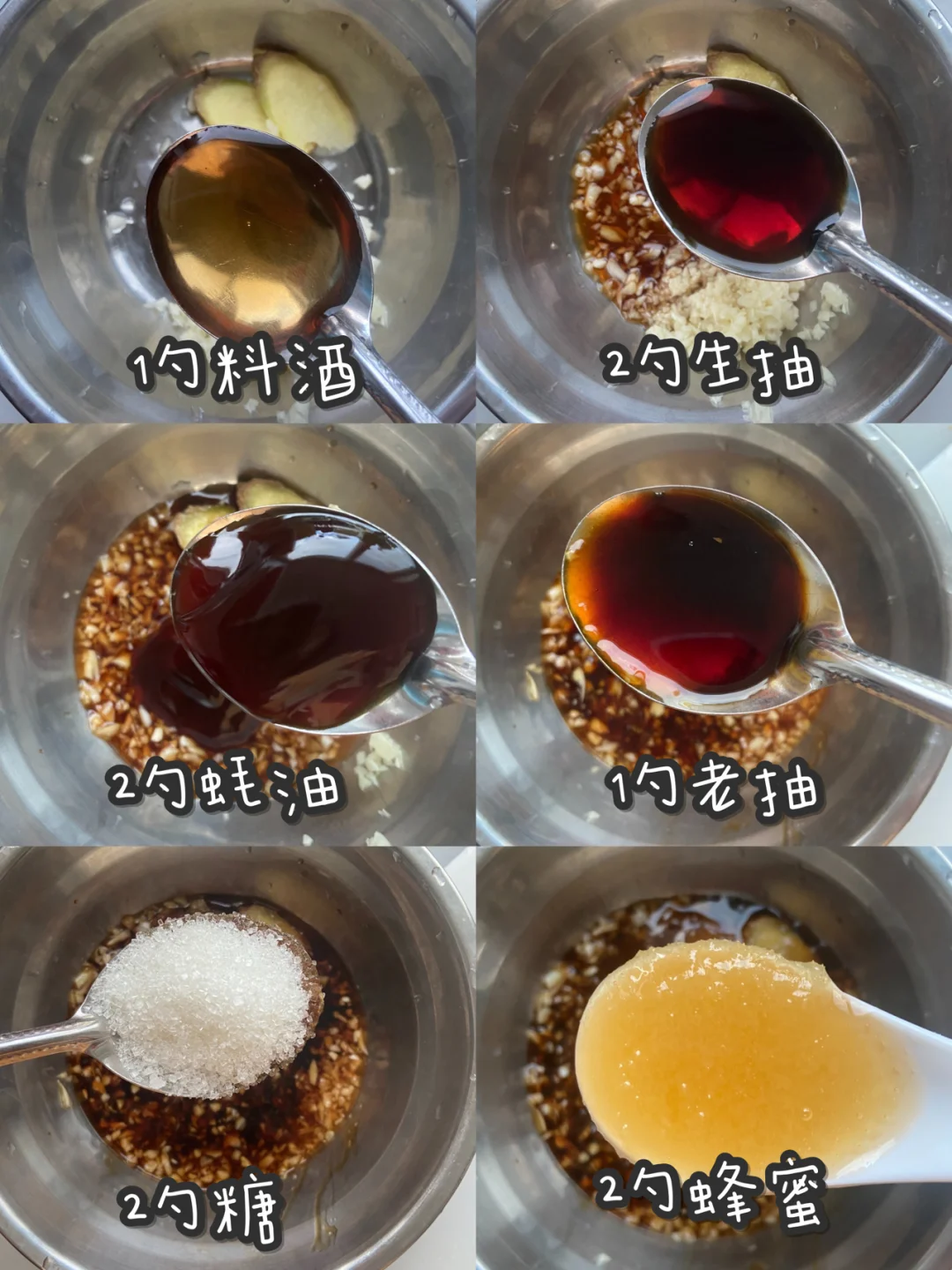 老抽一匙 料酒1勺 蜂蜜2勺(不喜欢太甜的可以放一勺) 生抽2勺 蚝油2勺 糖2勺