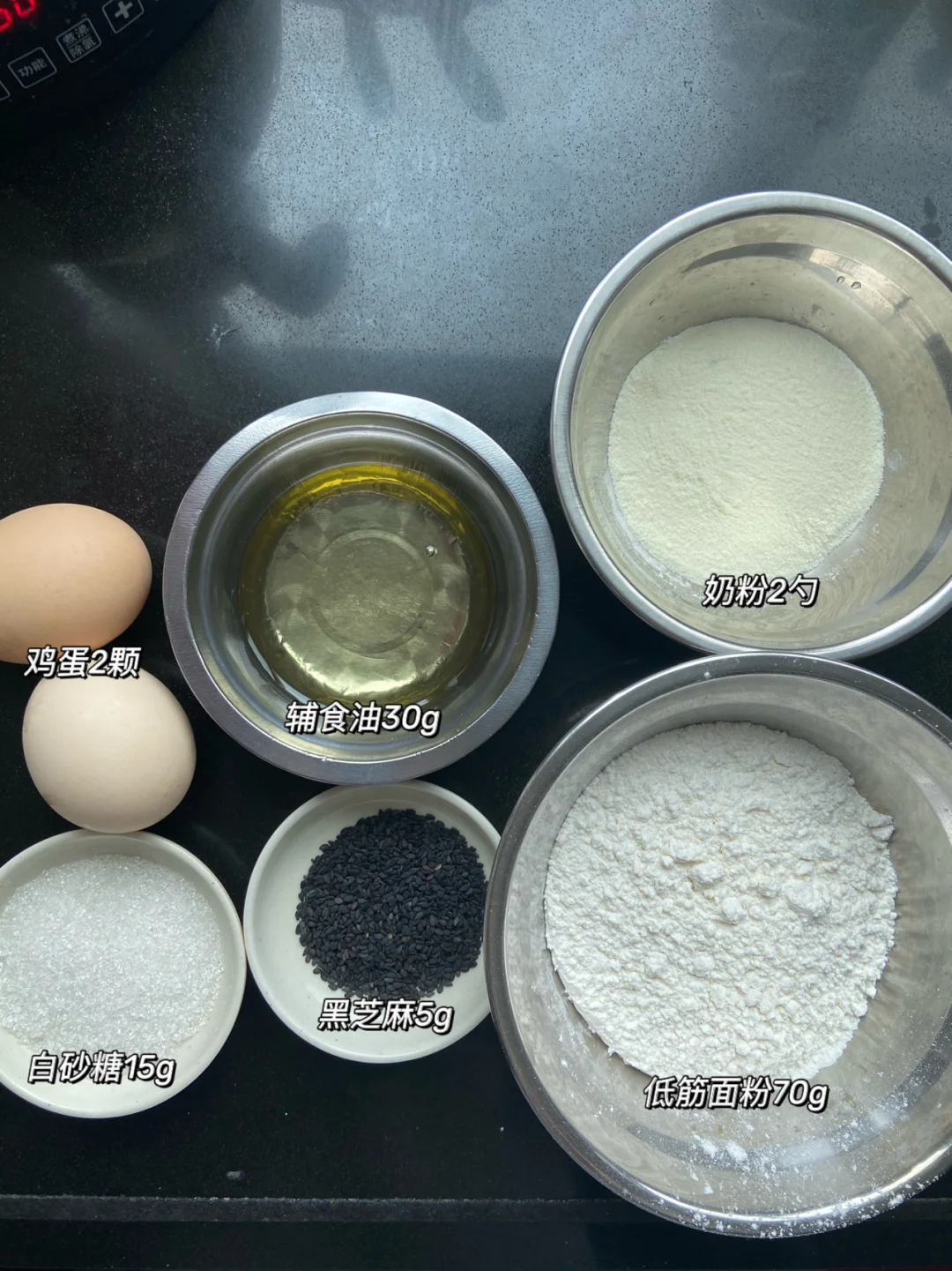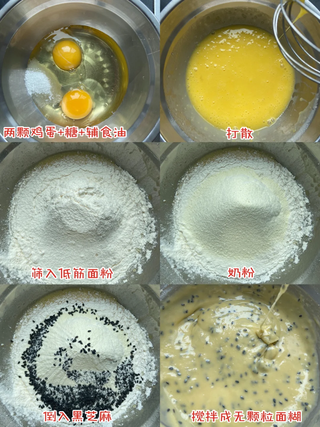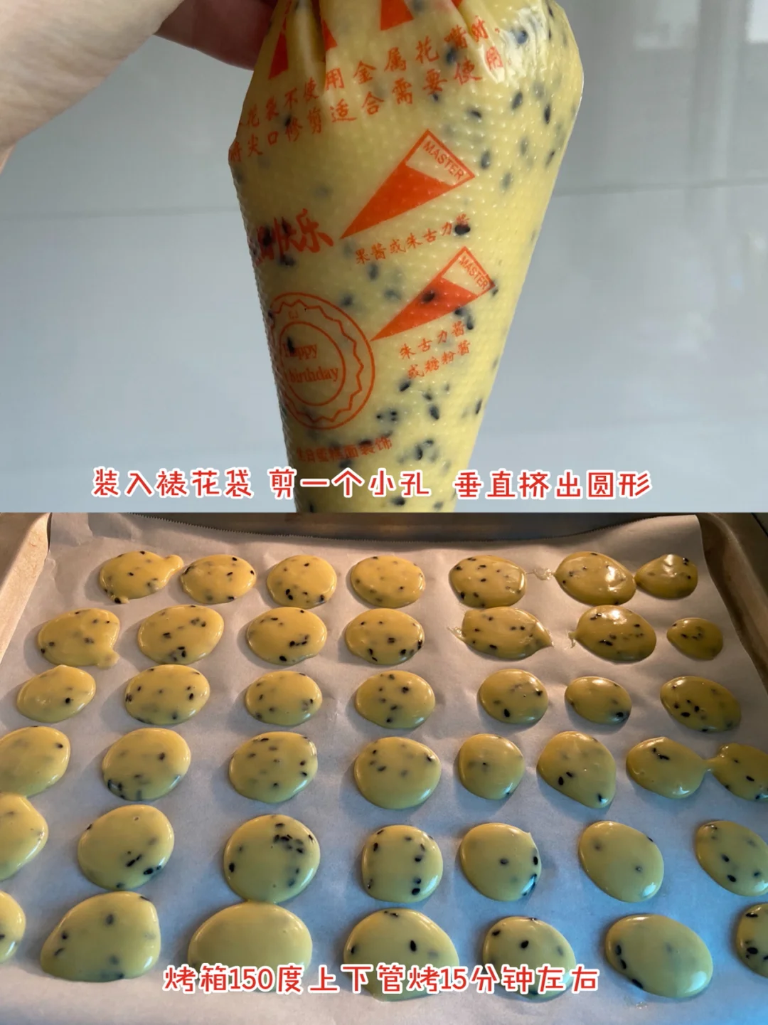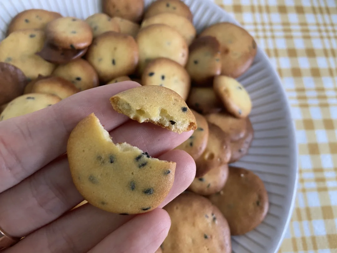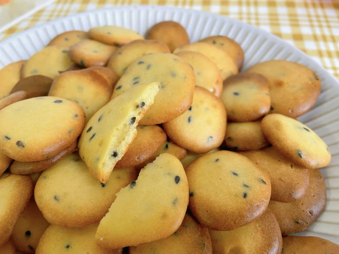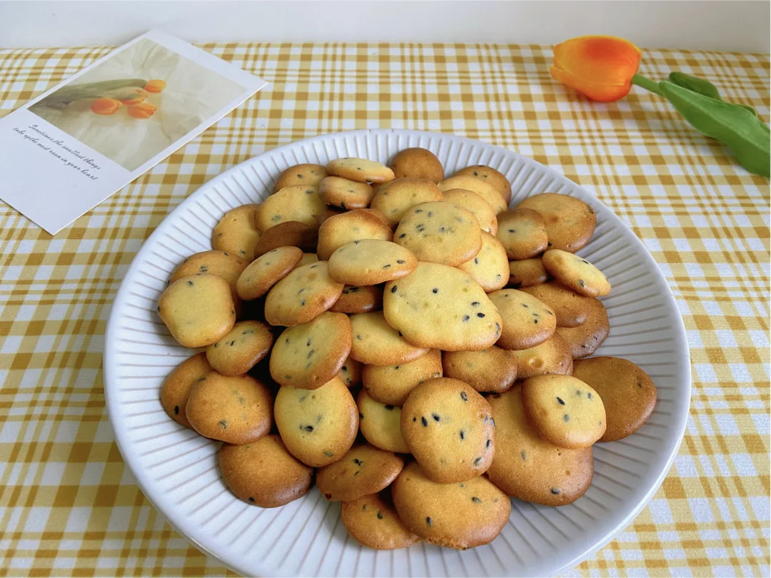 准备食材:✨✨✨✨✨ 低筋面粉70g 辅食油30g 鸡蛋2颗 白糖15g 黑芝麻5g 奶粉两勺 做法✨✨✨✨✨ 1️⃣两颗鸡蛋+糖+辅食油打散 2️⃣筛入低筋面粉和奶粉 3️⃣倒入黑芝麻搅拌成无颗粒面糊 4️⃣装入裱花袋 剪一个小孔 垂直挤出圆形 5️⃣烤箱150度上下管烤15分钟左右 美食日记|美食教程日常|宅家DIY|宅家花样美食|吃啥|下厨房|我的美食日记|美食分享|食谱|自制宝宝小零食|宝宝辅食日记|烤箱美食|爆款美食
