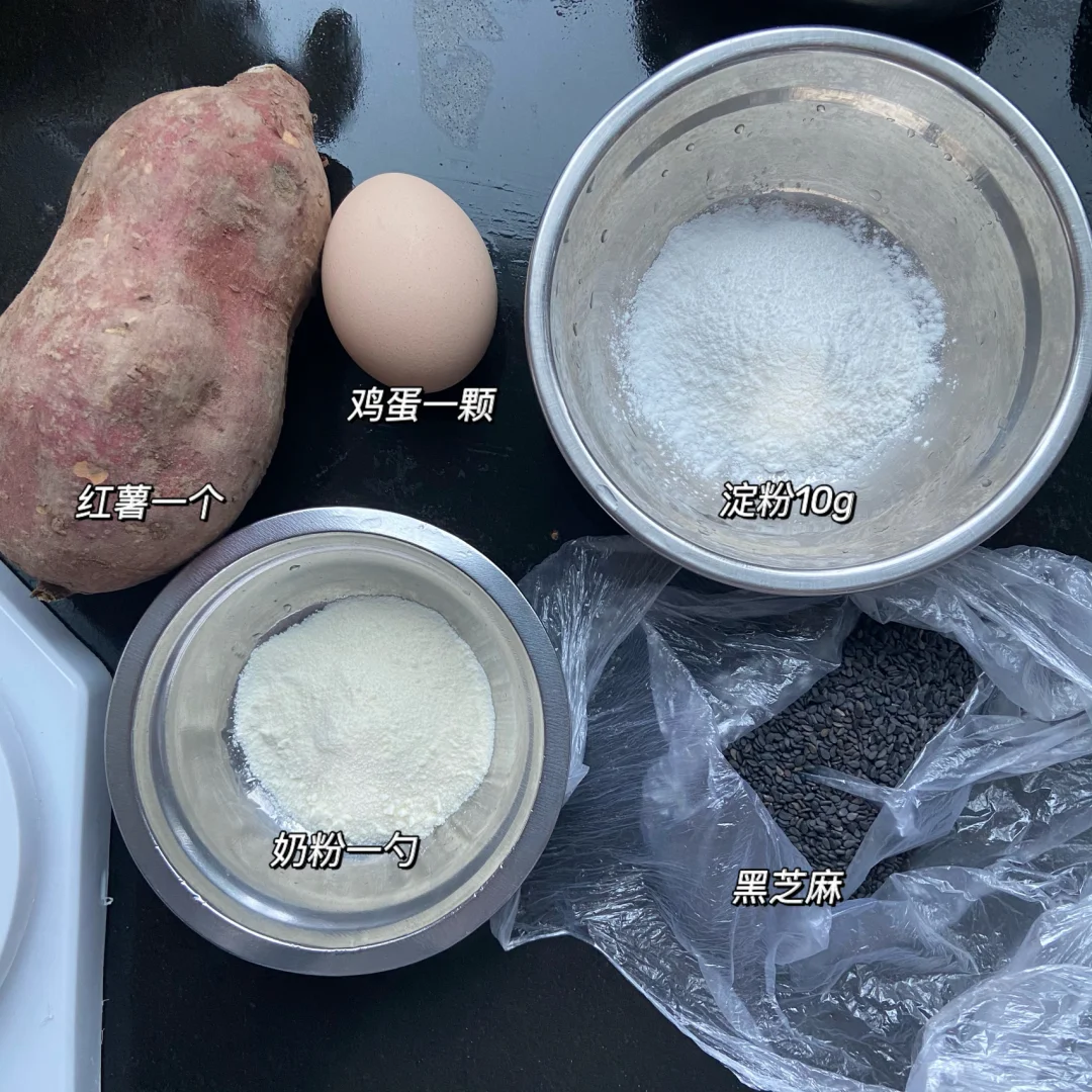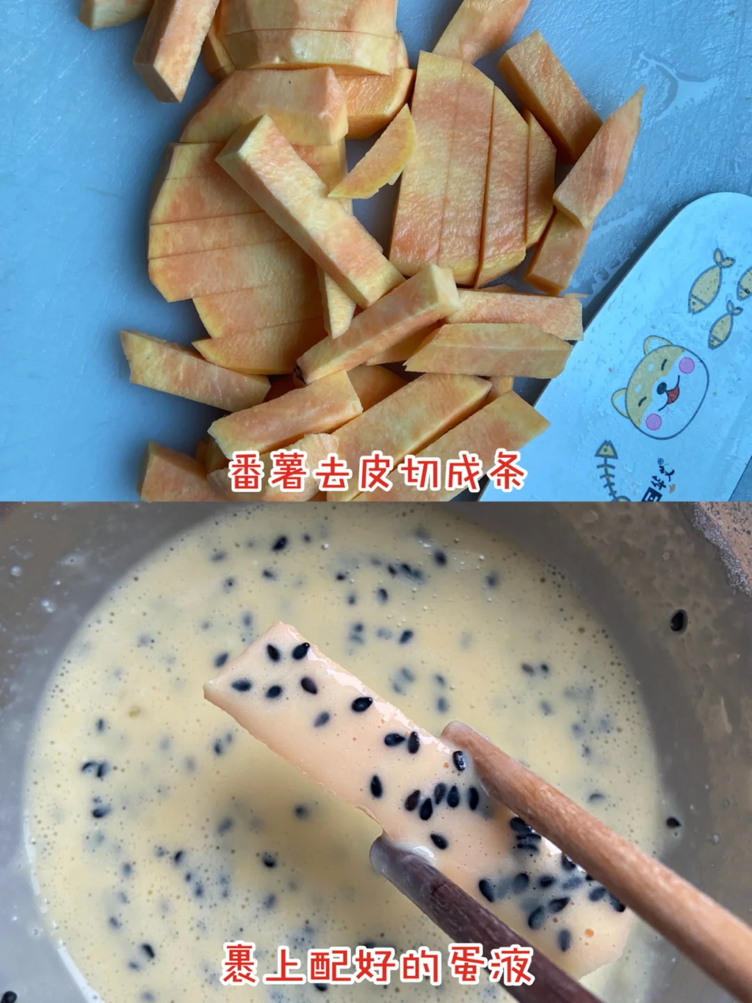 准备材料:✨✨✨✨✨ 红薯一个 鸡蛋一个 淀粉10g 黑芝麻 奶粉一勺 做法✨✨✨✨✨ 1️⃣鸡蛋打散加奶粉 淀粉搅拌均匀 加入黑芝麻 2️⃣红薯去皮切成条 3️⃣裹上蛋液 依次摆进烤盘 4️⃣烤箱上下管190度20分钟左右即可 美食日记|美食教程日常|宅家DIY|宅家花样美食|吃啥|下厨房|我的美食日记|美食分享|食谱|自制宝宝小零食|宝宝辅食日记|烤箱美食|爆款美食