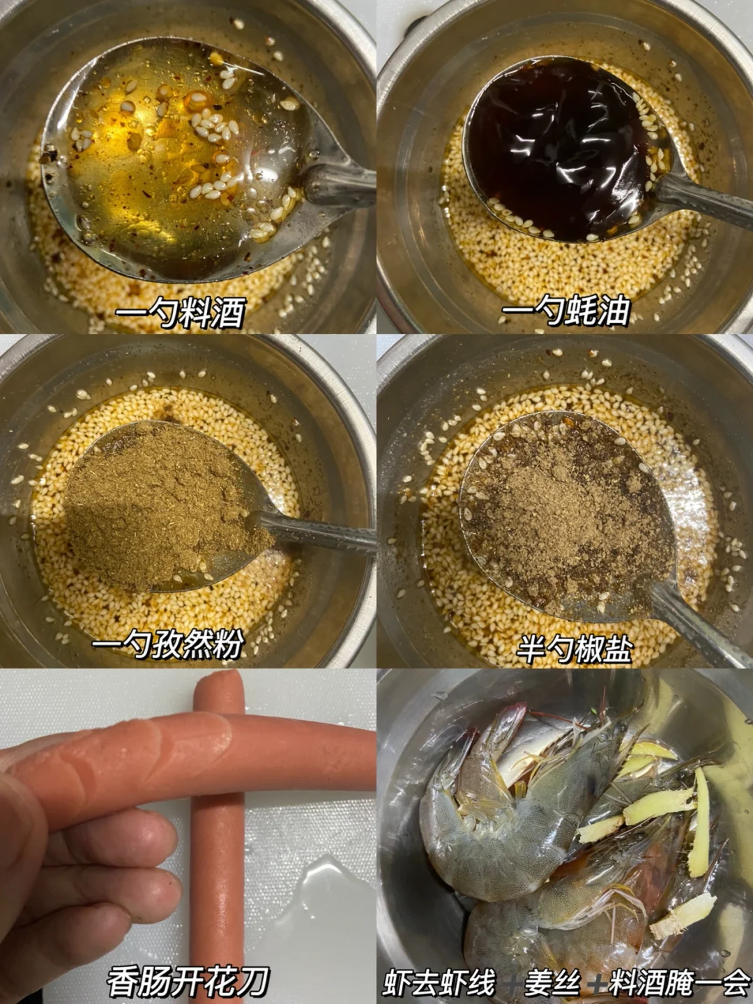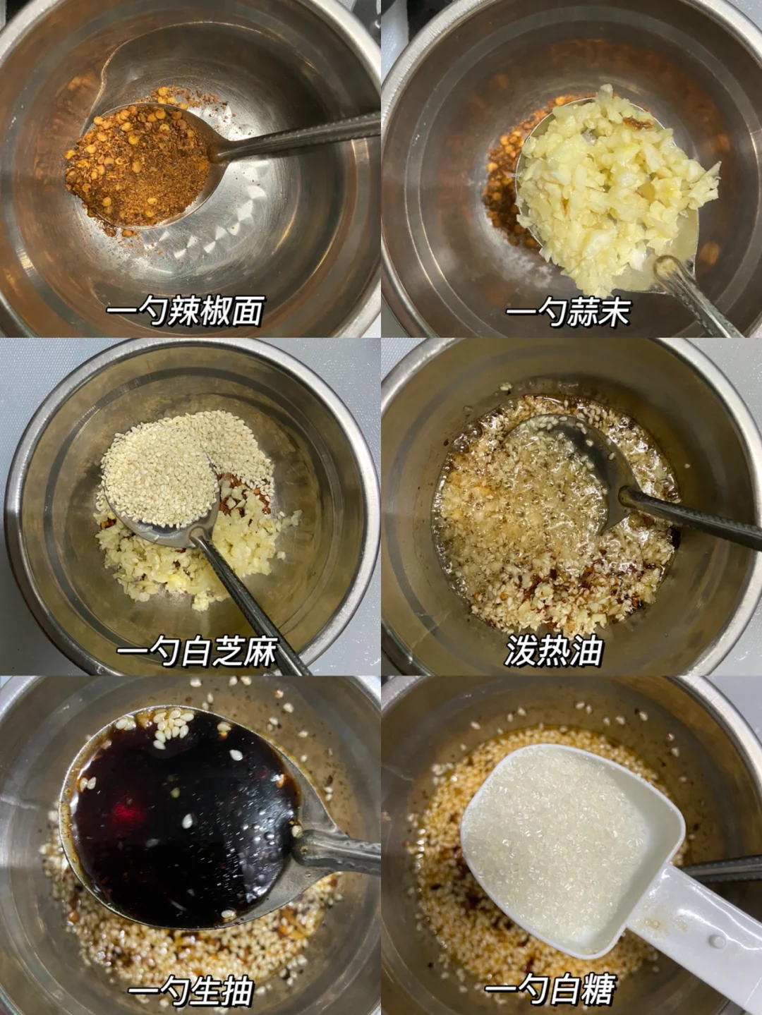 1️⃣调酱汁:一勺辣椒面➕一勺蒜末➕一勺白芝麻泼热油➕两勺生抽➕一勺糖➕一勺料酒➕一勺蚝油➕一勺孜然粉➕半勺椒盐搅拌均匀