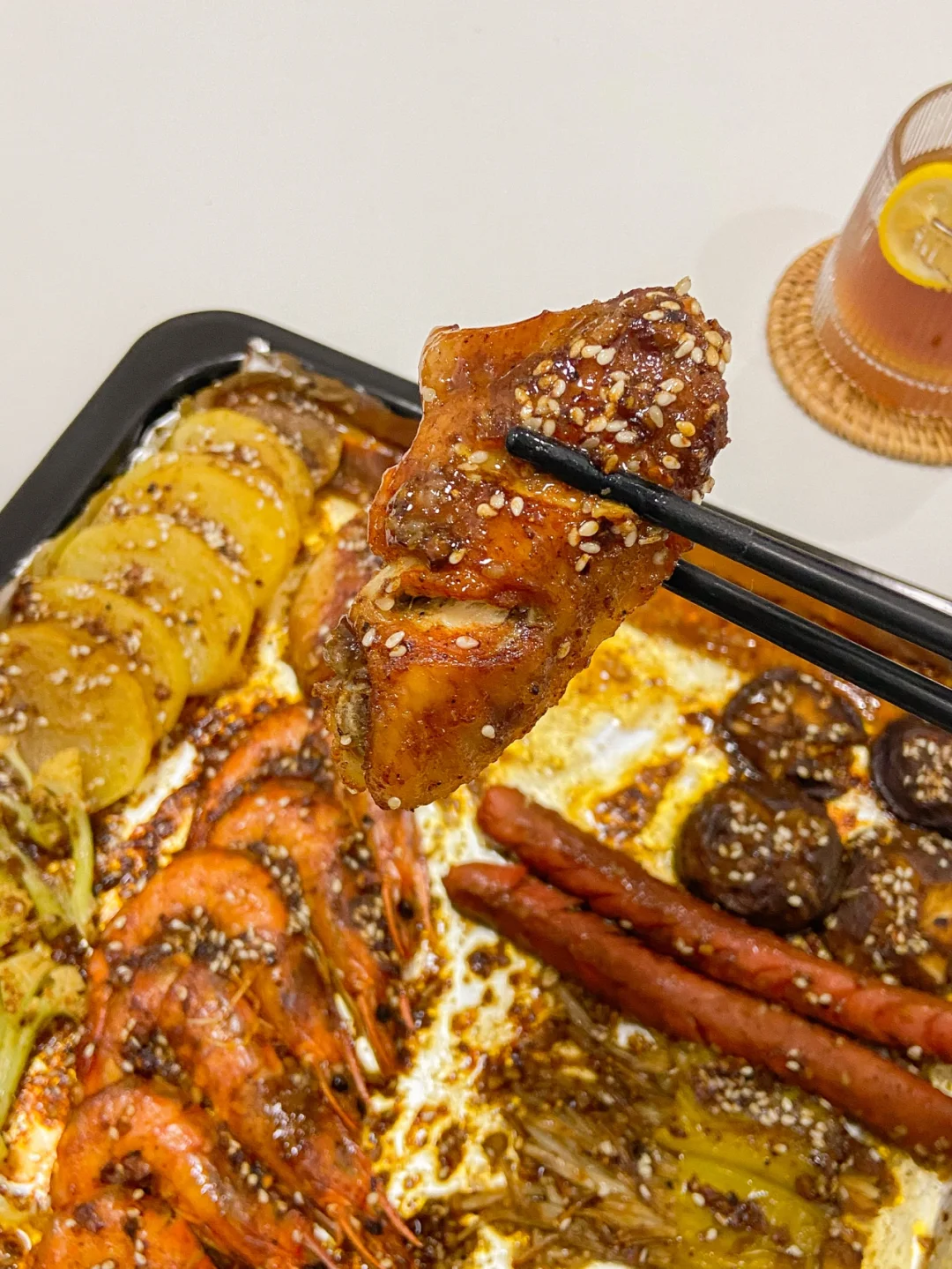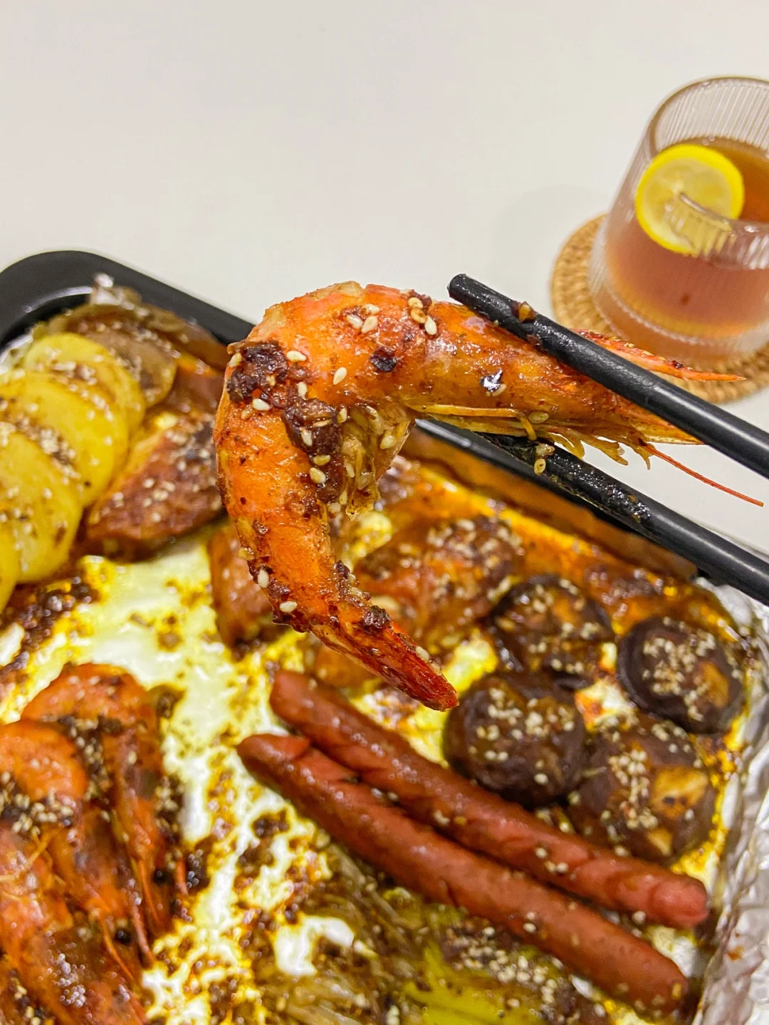 3️⃣烤盘包上锡纸,刷一层酱汁,放入食材。