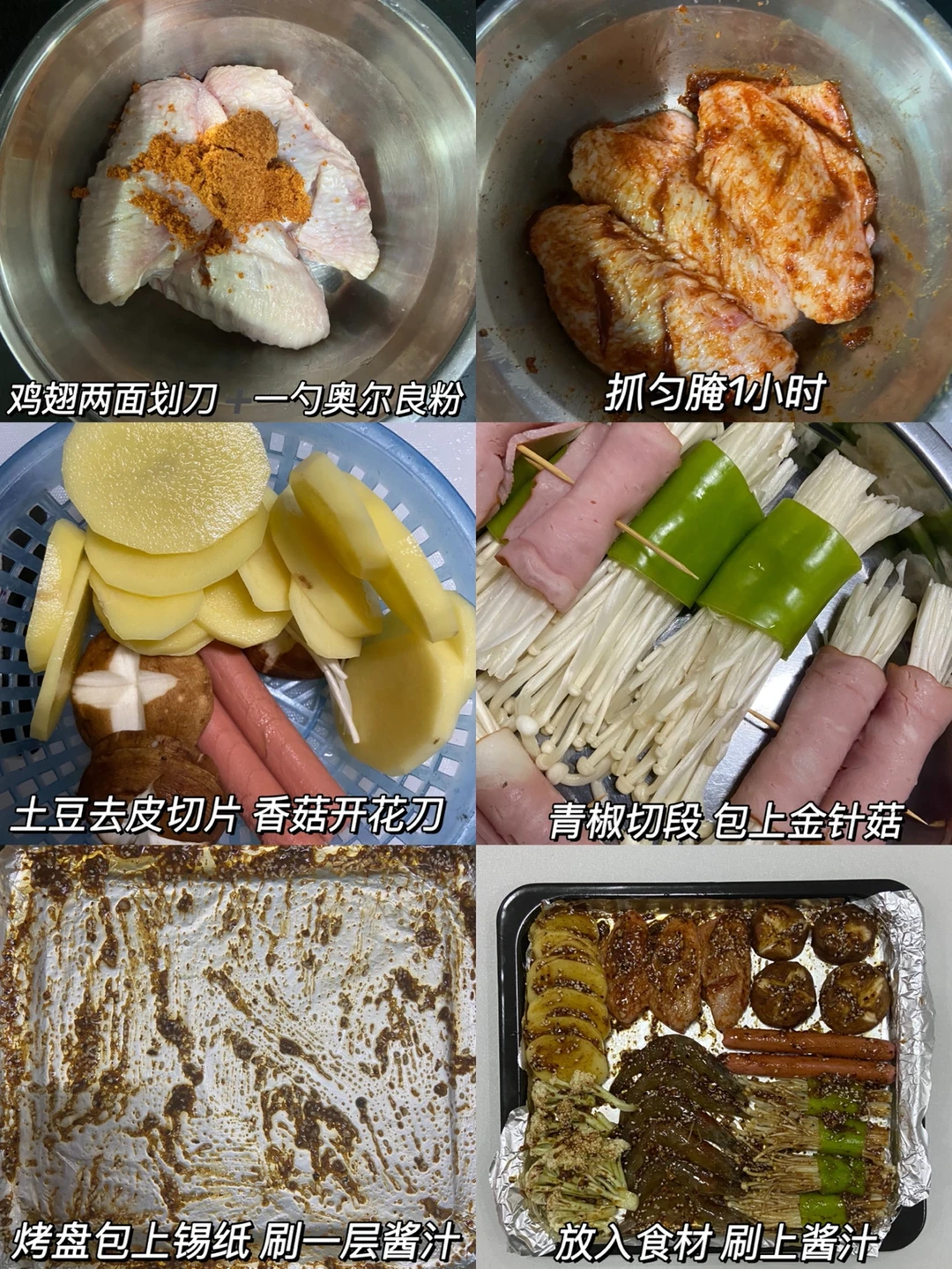 2️⃣鸡翅两面划刀,➕一勺奥尔良粉腌制一小时,火腿肠改花刀,虾去虾线➕一勺料酒➕姜丝腌制一会,青椒切段,包上金针菇 土豆去皮切片 香菇开花刀。