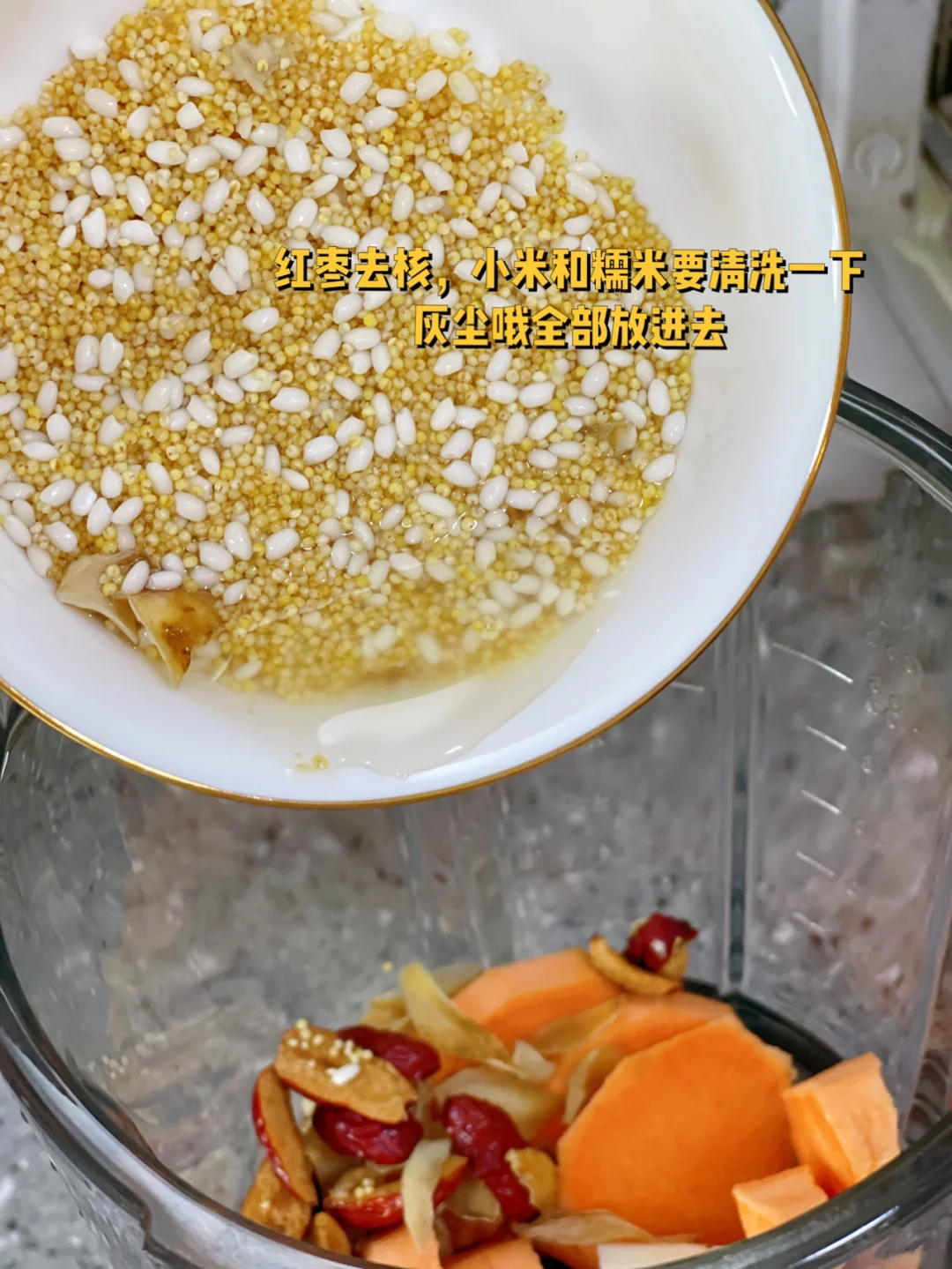 2. 红枣去核,小米和糯米要清洗一下灰尘哦全部放进去
