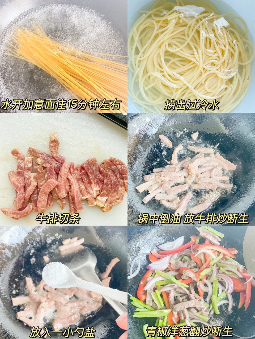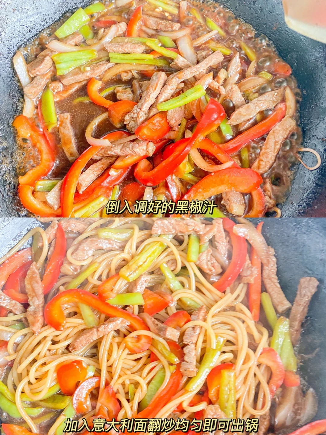 4️⃣锅中倒油,放牛排炒断生,放入一小勺盐,青椒洋葱翻炒断生,倒入调好的黑椒汁,意大利面,翻炒均匀即可出锅✔️