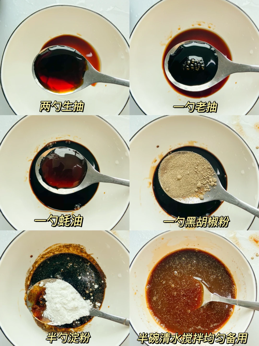 3️⃣ 期间调个黑胡椒酱:两勺生抽➕一勺老抽➕一勺蚝油➕一勺黑胡椒粉➕一勺玉米淀粉➕半碗清水搅拌均匀备用。