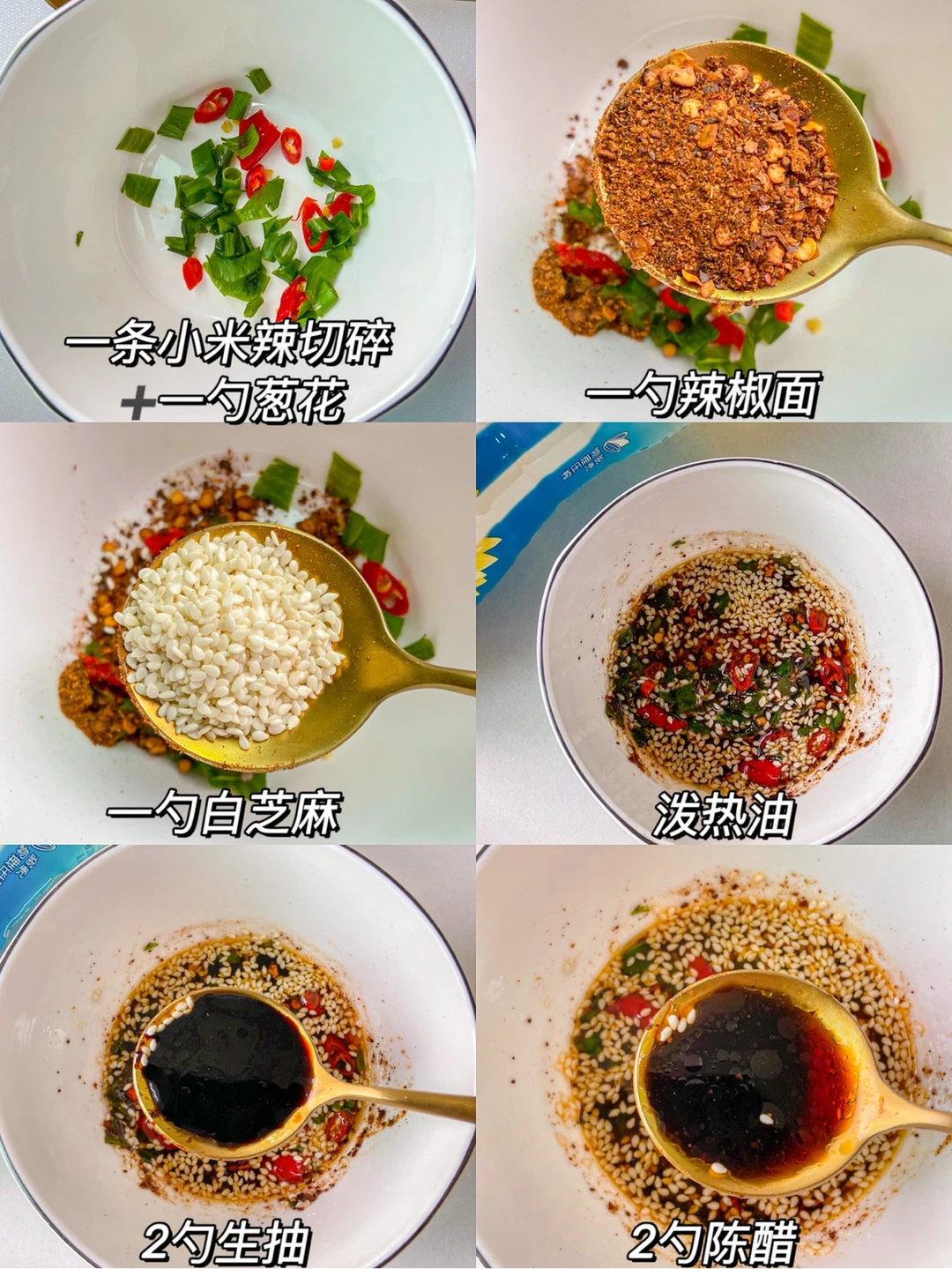1️⃣先调个酱汁:碗中一条小米辣切碎 ➕一勺葱花➕一勺辣椒面➕一勺白芝麻