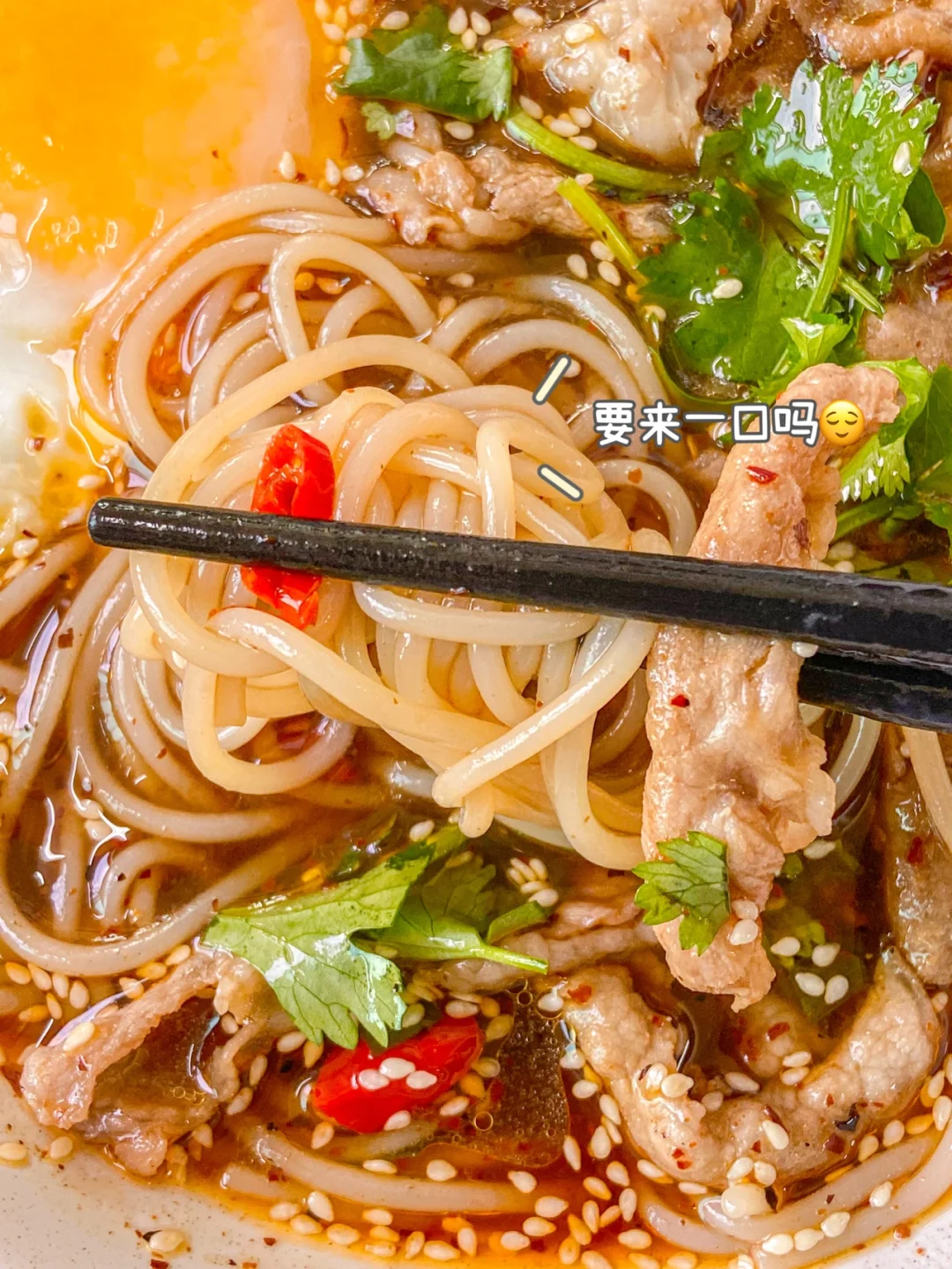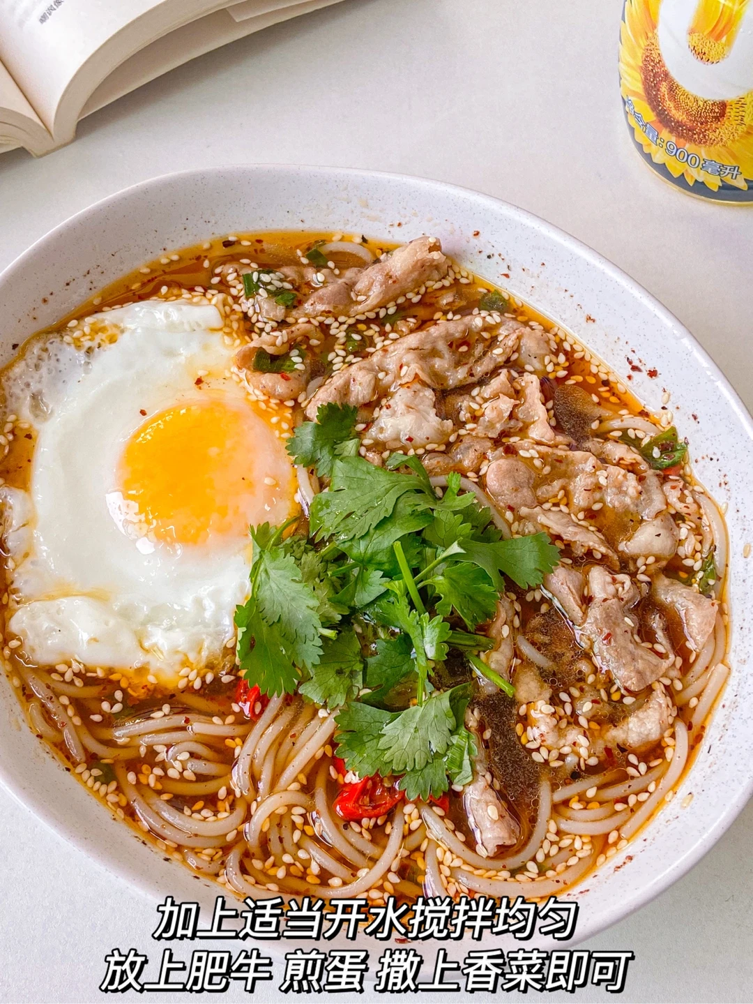 5️⃣放上肥牛 煎蛋 撒上香菜即可✅