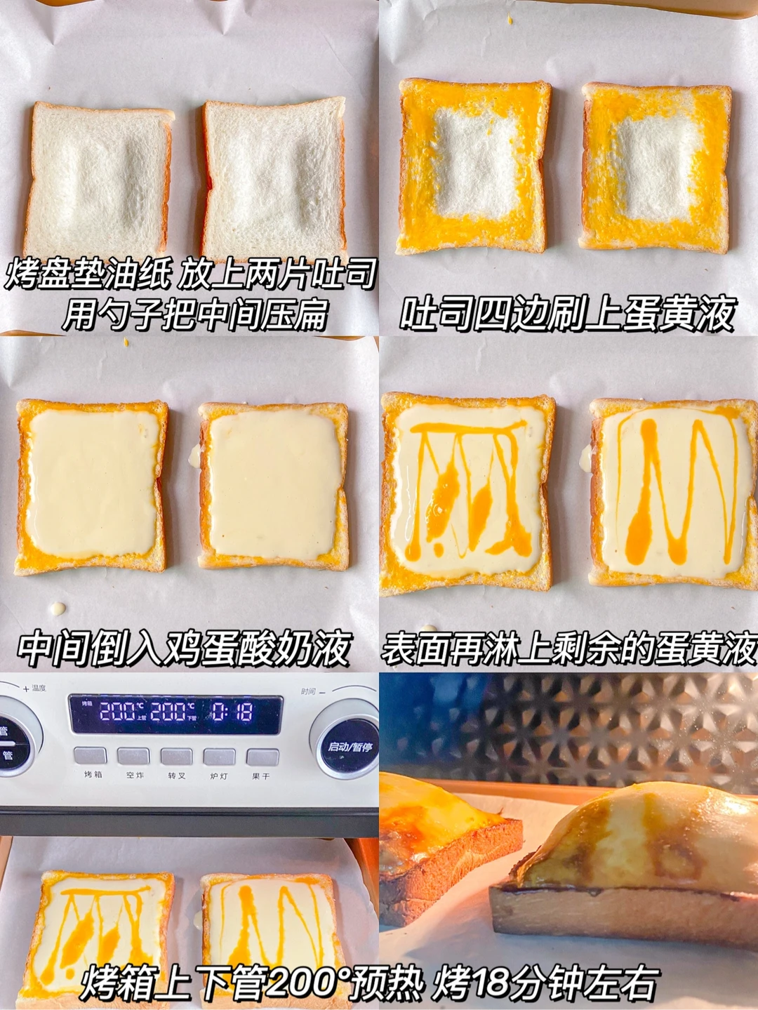 3️⃣烤箱上下管200度预热 吐司四边刷上蛋黄液 中间倒入鸡蛋酸奶液 表面再淋上剩余的蛋黄液