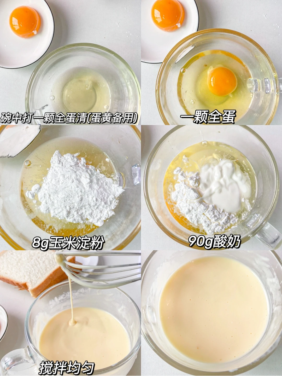 1️⃣碗中打一颗全蛋➕一颗蛋清(蛋黄放着备用)➕8g玉米淀粉➕90g酸奶搅拌均匀