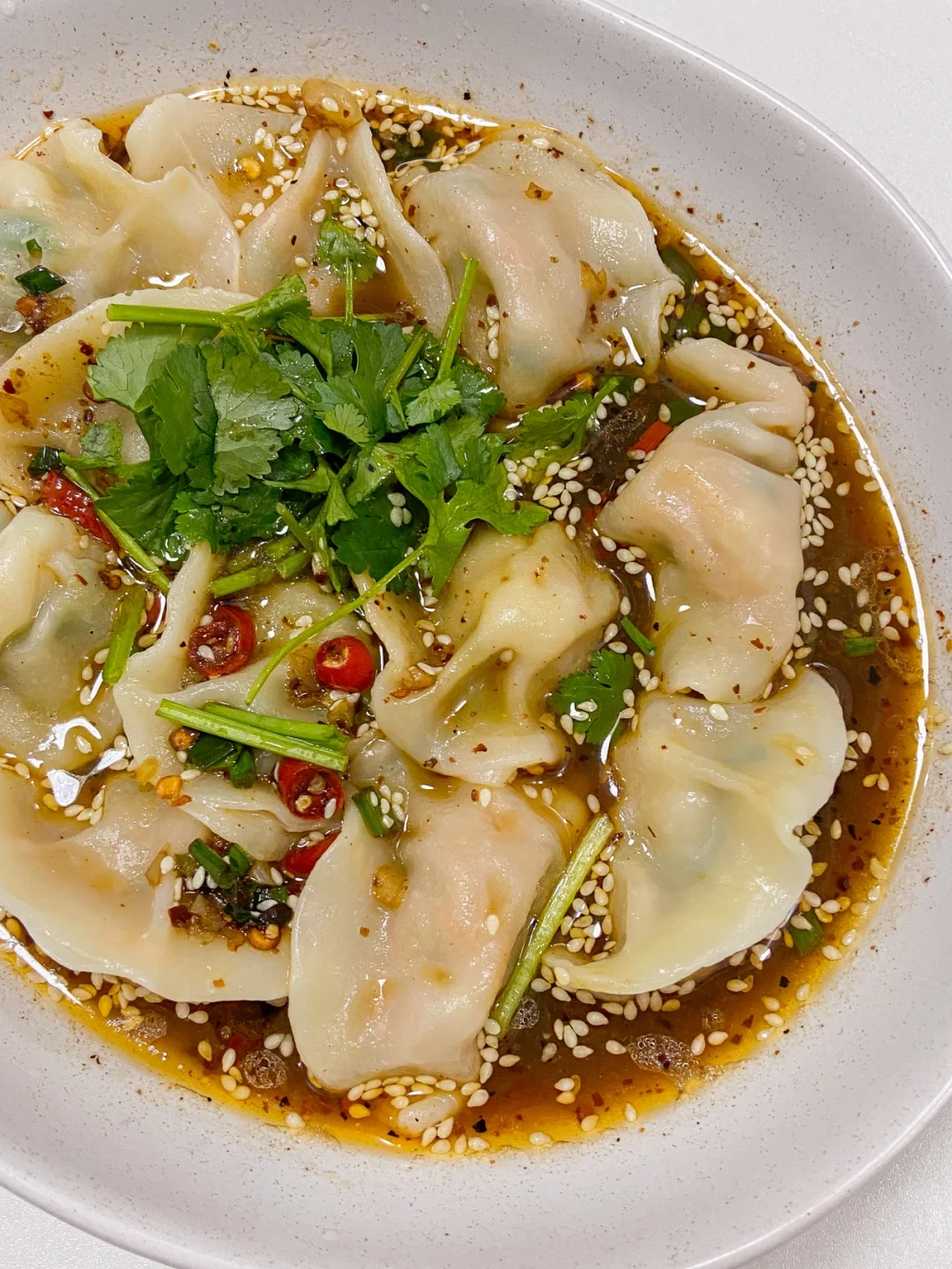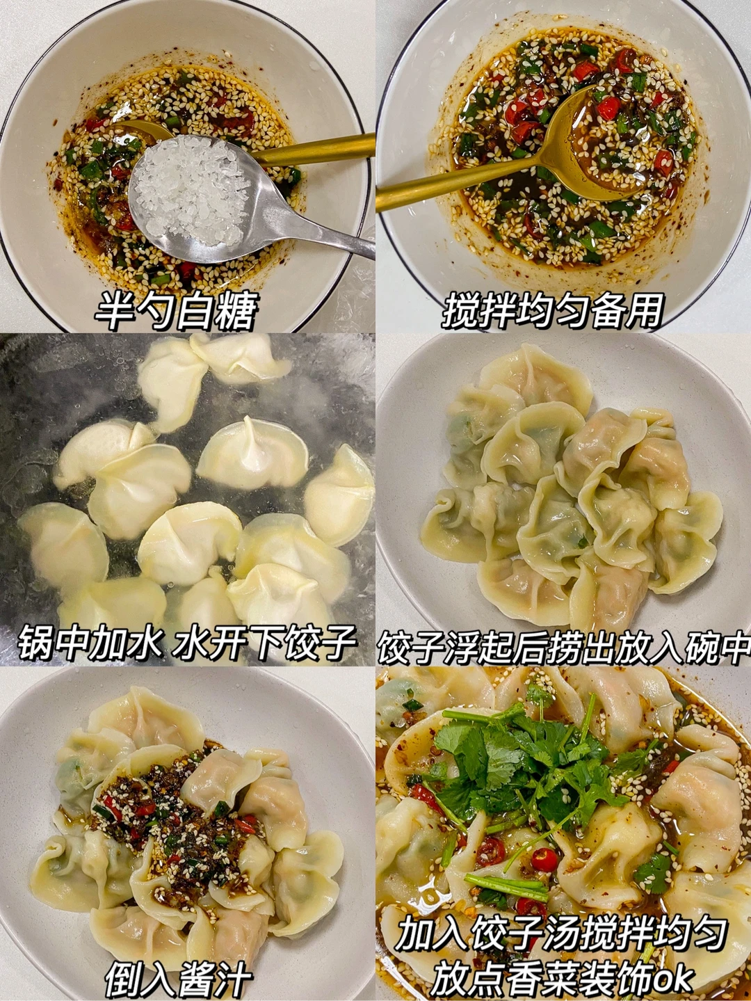 3️⃣饺子浮起后捞出放入碗中 倒入酱汁 加入适量饺子汤搅拌均匀 放点香菜装饰即可✔️