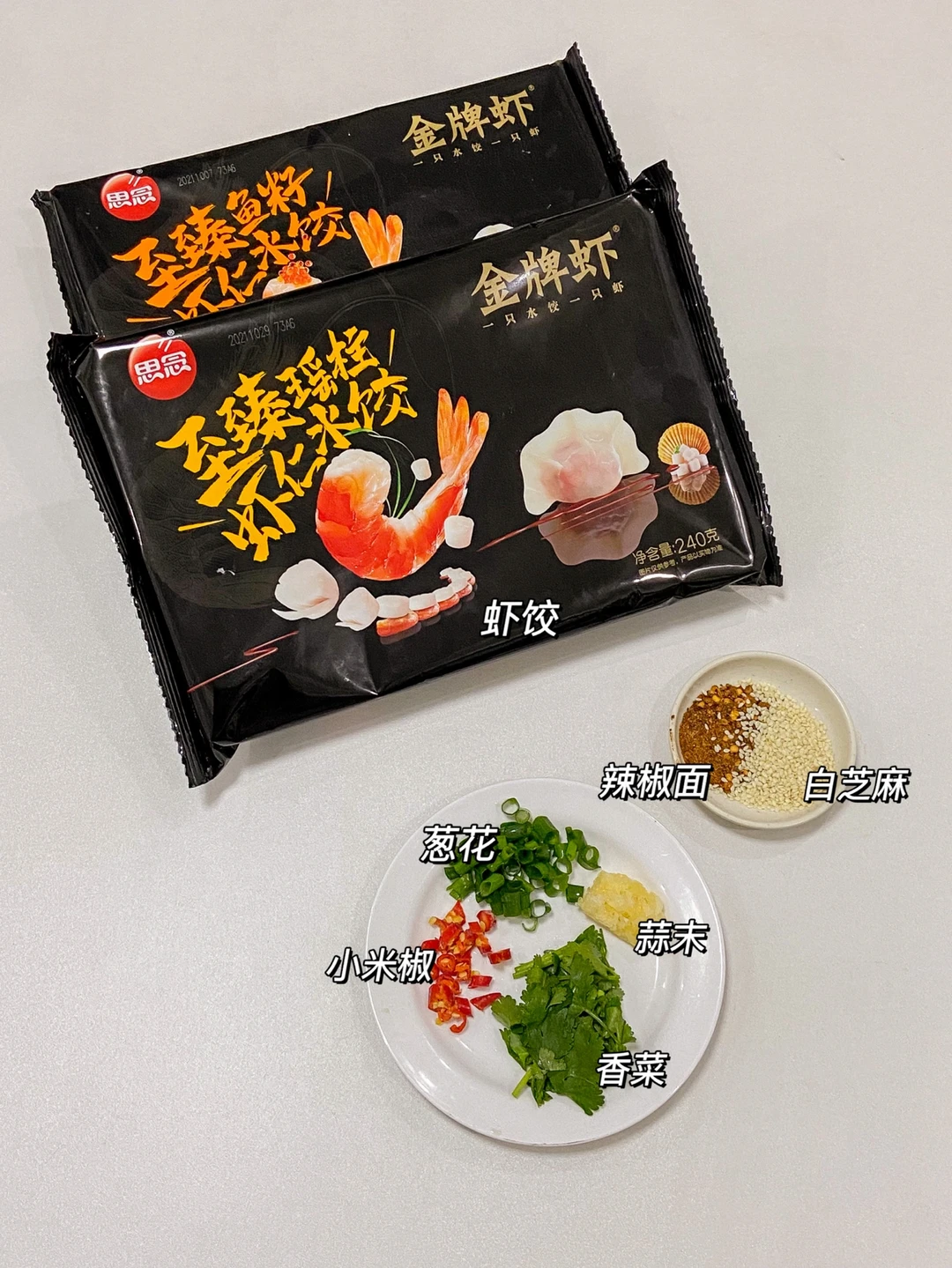 思念金牌虾水饺 蒜末 葱花 香菜 小米椒 辣椒面 白芝麻