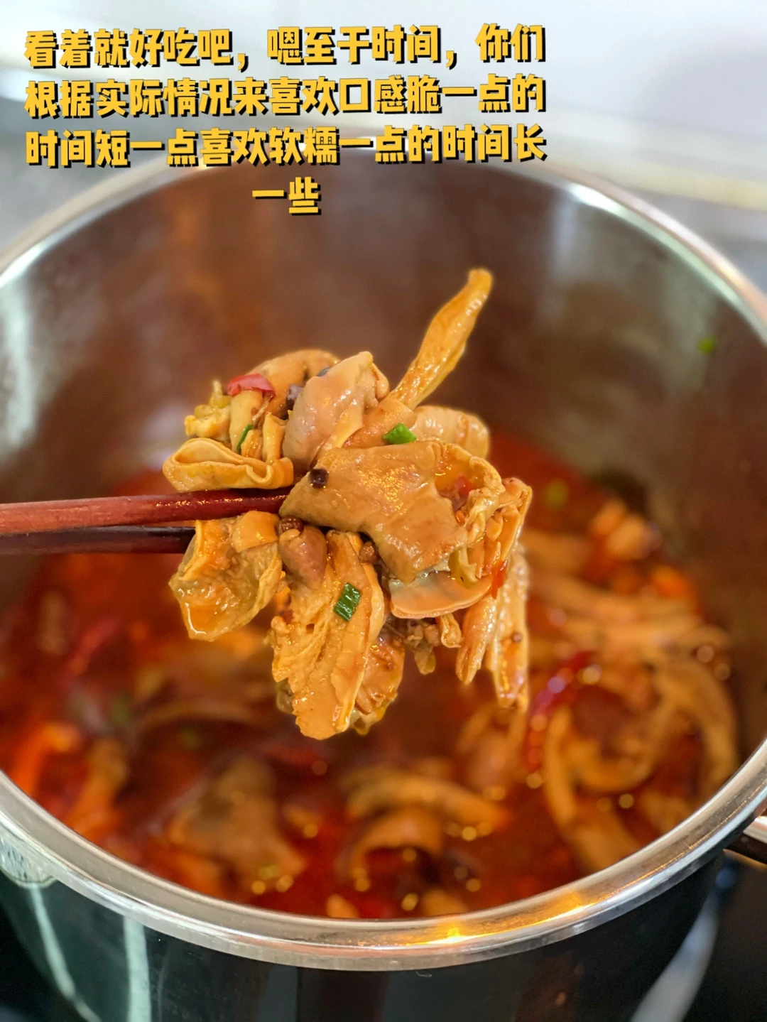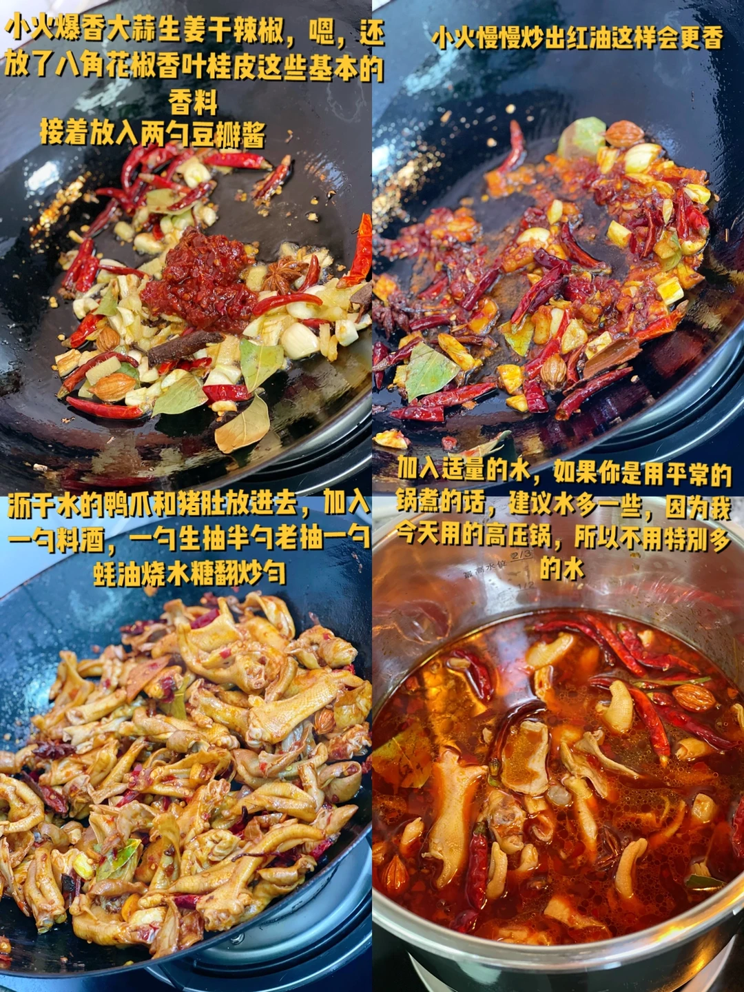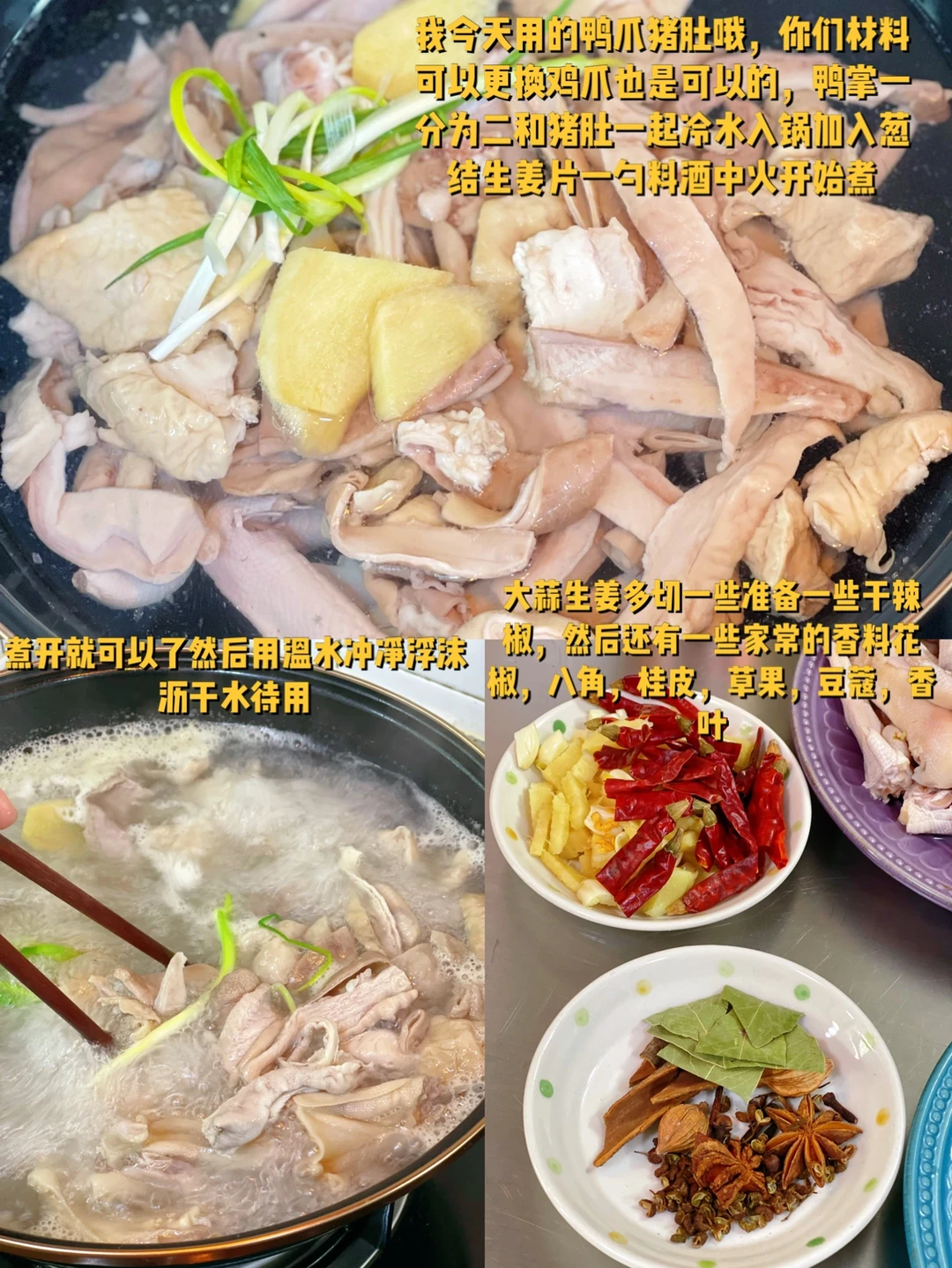 1. 我今天用的鸭爪猪肚哦,你们材料可以更换鸡爪也是可以的,鸭掌一分为二和猪肚一起冷水入锅加入葱结生姜片一勺料酒中火开始煮