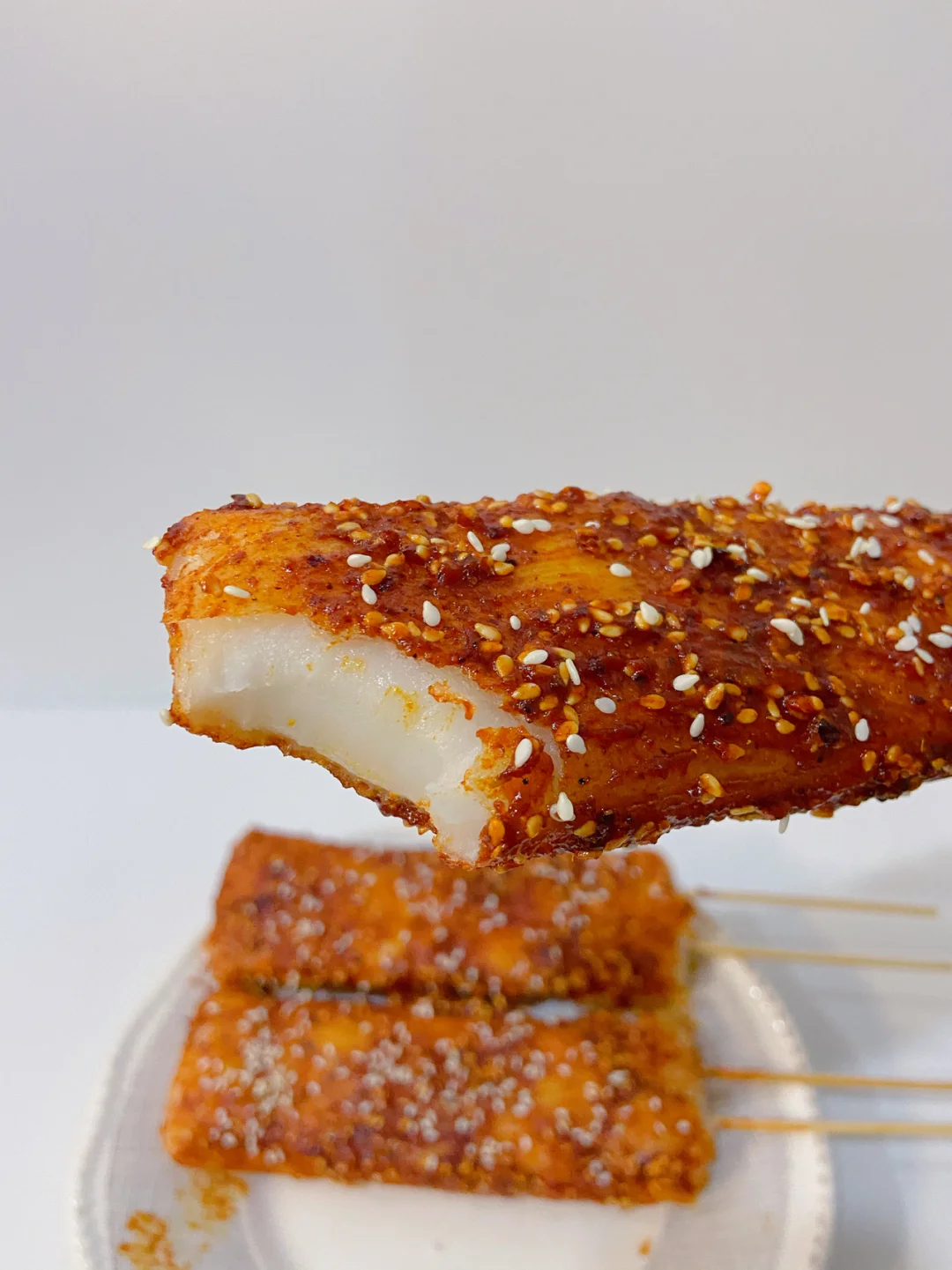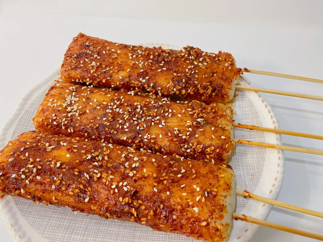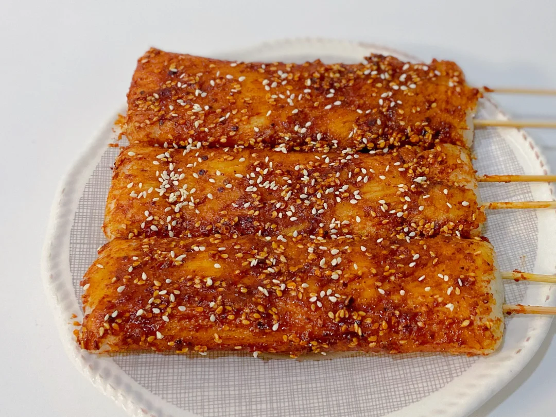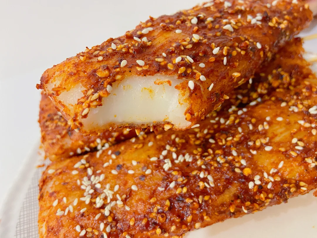 3️⃣小火慢煎年糕 煎至两面焦脆 插上竹签 刷上酱料 撒上白芝麻即可开吃