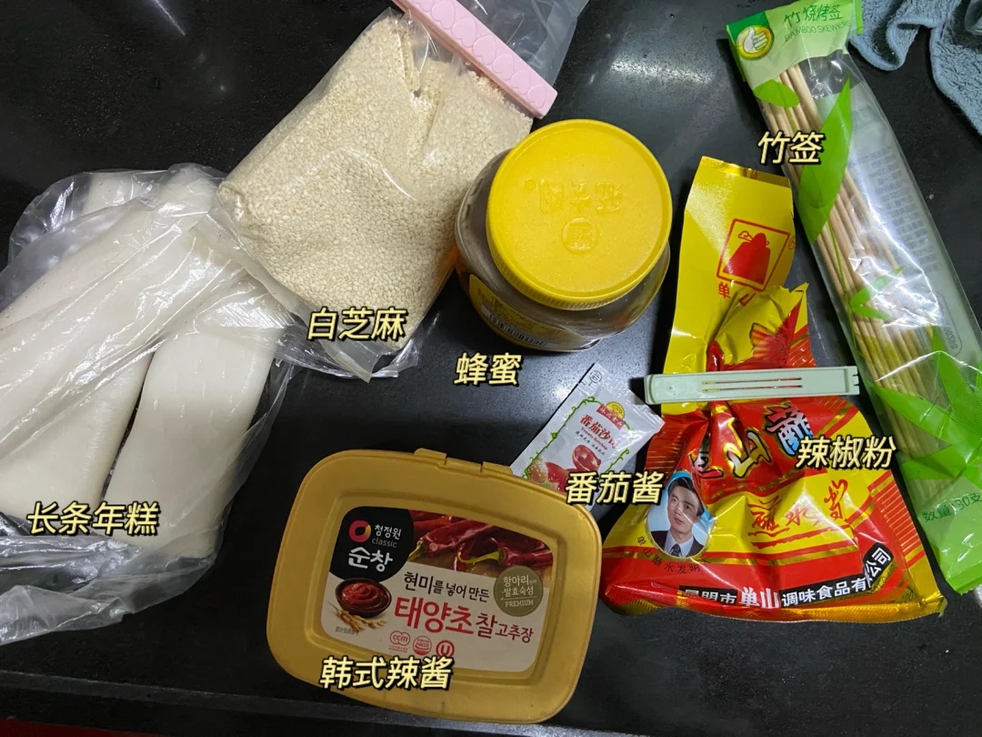 长条年糕 竹签 韩式辣酱 番茄酱 蜂蜜 白芝麻 辣椒粉