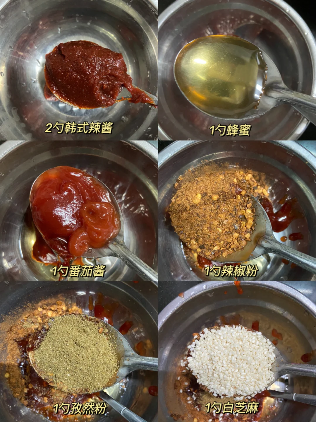 2️⃣调酱汁:2勺韩式辣酱+1勺蜂蜜+1勺番茄酱+1勺辣椒粉+1勺孜然粉+1勺白芝麻