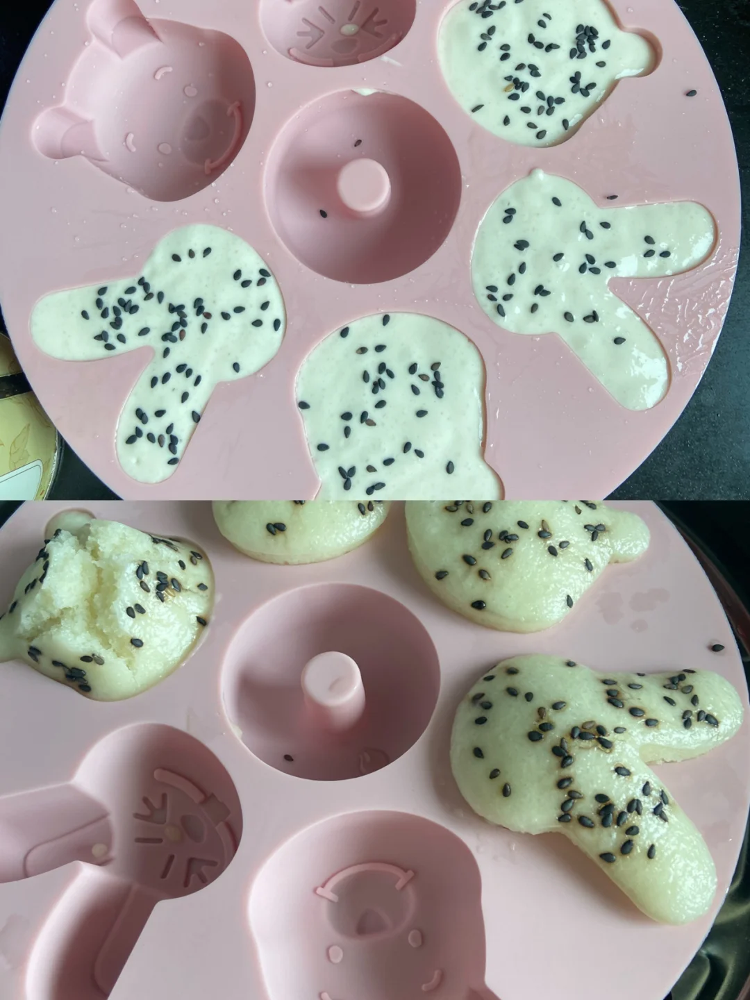 5️⃣模具刷油 倒入模具中 撒上黑芝麻 倒5分满就行