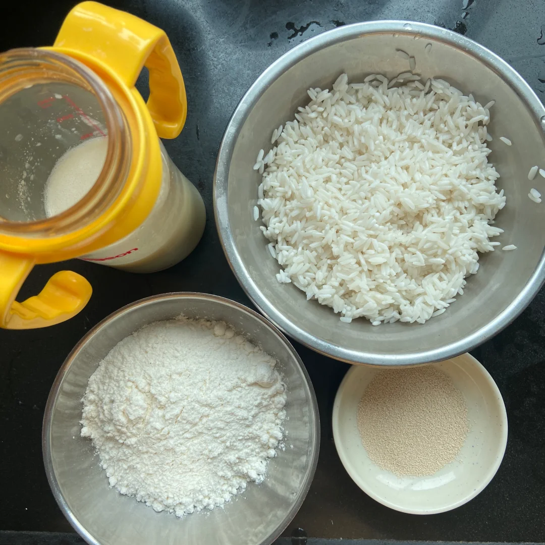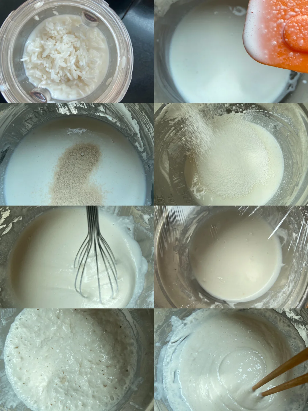 3️⃣盖上保鲜膜 静置发酵至两倍大 发酵好的米糊上面会有很多明显的气孔