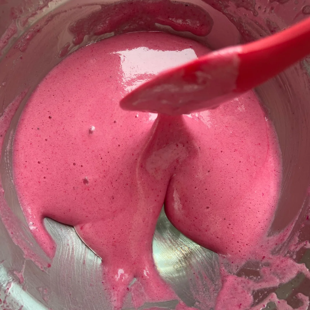 3️⃣打蛋器搅拌一下蛋黄 加入火龙果汁继续打发不要犹豫不要怀 打到可以写出清晰的8字 才是成功成功的