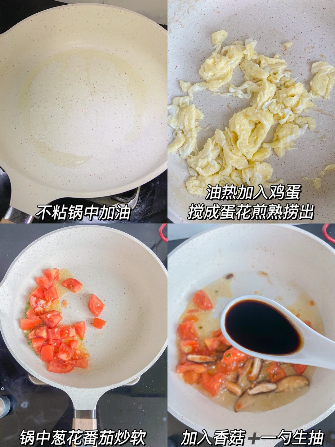 4️⃣锅中葱花番茄炒软加入香菇➕一勺生抽 加入青菜火腿翻炒均匀