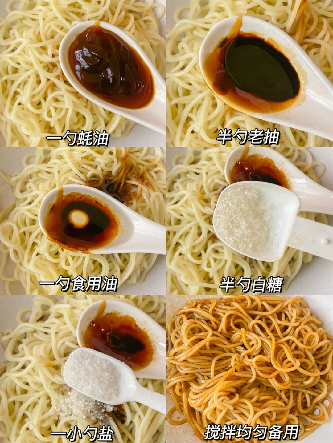2️⃣面条煮熟过凉水捞出放入碗中 加入1勺生抽➕1勺蚝油➕半勺老抽➕1勺食用油➕半勺白糖➕一小勺盐搅拌均匀备用