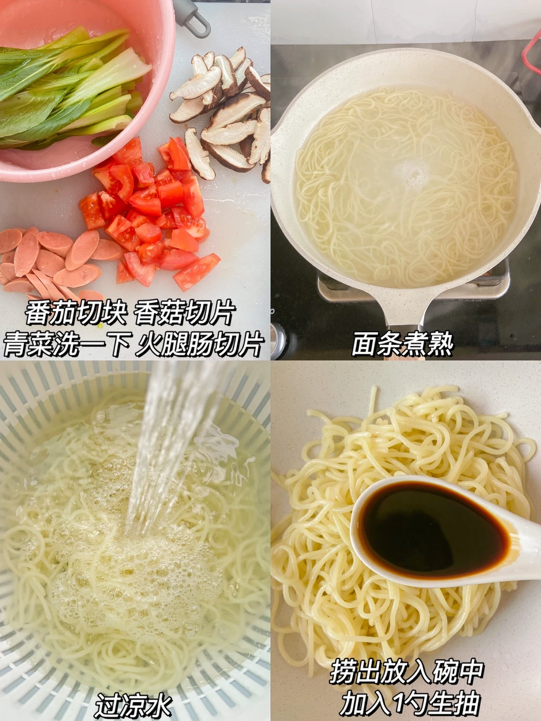 1️⃣番茄切块 香菇切片 青菜洗一下 火腿肠切片