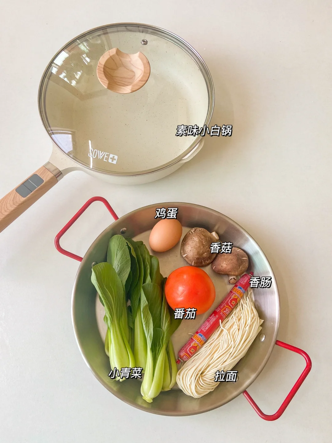 番茄1个 鸡蛋1个 香菇2朵 青菜4颗 香肠一根 面条