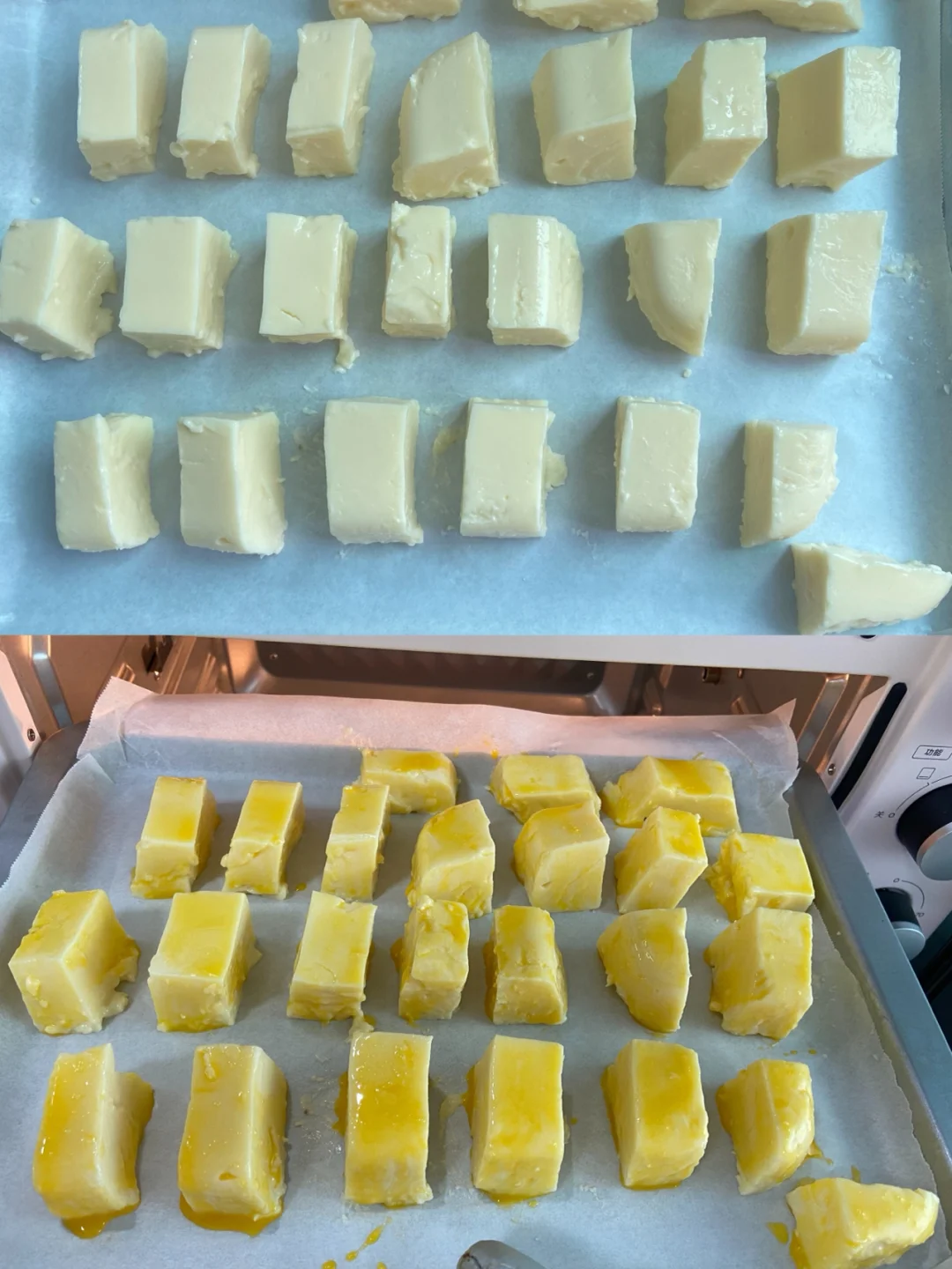 牛奶居然还能烤起来吃 给谁都不信 简单0食材的烤牛奶 味道就像蛋挞的心 太好吃啦 超级q弹[偷笑R] 🌟准备食材: 牛奶500克 蛋黄两个 芝士片一片 糖20克(喜欢甜一点就多放一些) 玉米淀粉50克 🌟制作方法: 1️⃣除了芝士片以外所有食材混合均匀 然后再放入芝士片 小火煮到浓稠状态倒入任意模具 按压一下 盖上保鲜膜冰箱冷藏3小时左右 2️⃣3小时后倒扣切块 刷上蛋黄液 烤箱预热上下火230度 15钟左右 表面出现焦黄即可✔️