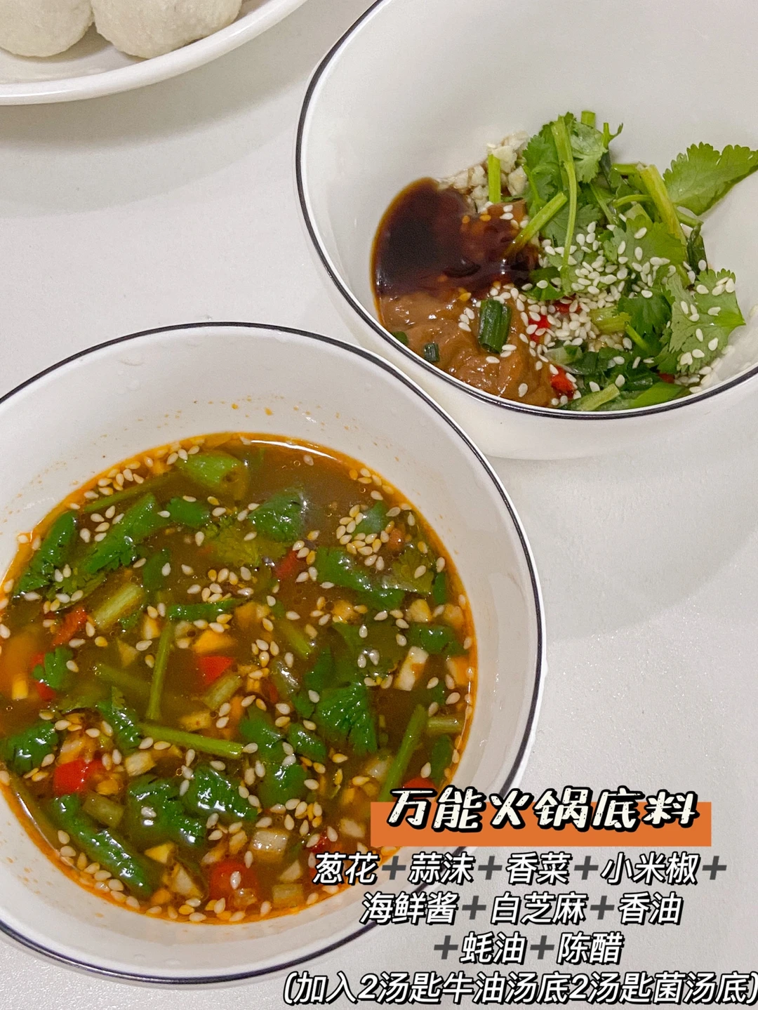 葱花➕蒜沫➕香菜➕小米椒➕海鲜酱➕白芝麻➕香油 ➕蚝油➕陈醋(加入2汤匙牛油汤底2汤匙菌汤底)