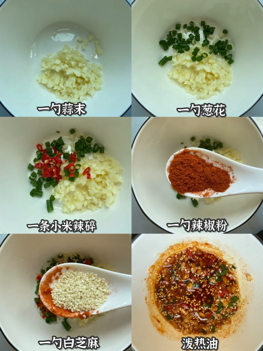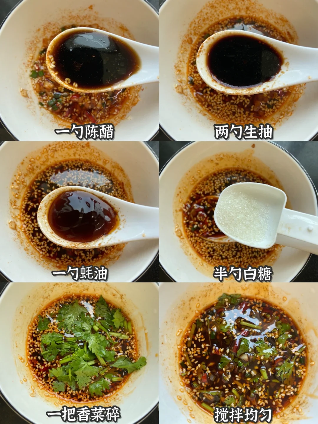 3️⃣炸的时间来调个酱汁:一勺蒜末➕一勺葱花➕一条小米辣碎➕一勺辣椒粉➕一勺白芝麻泼热油 ➕一勺陈醋➕两勺生抽➕一勺蚝油➕半勺糖搅拌均匀➕香菜
