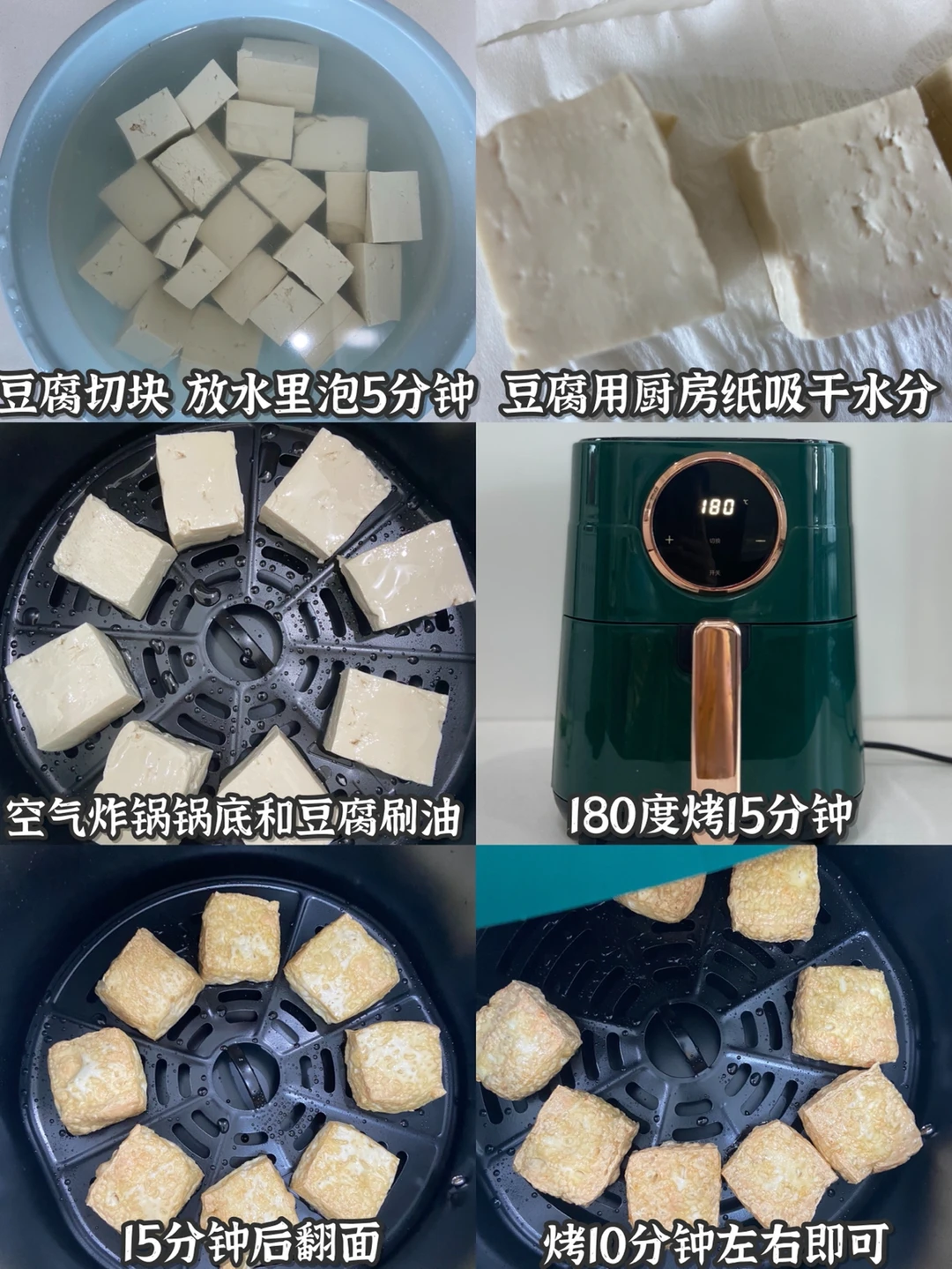 2️⃣豆腐用厨房纸吸干水分 空气炸锅锅底和豆腐刷油 180度烤15分钟 翻面再烤10分钟左右(喜欢老的烤久一点 每个锅脾气不一样 可以中途抽出来看一下)