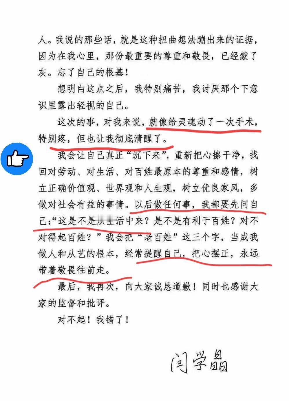 看完闫学晶的那封道歉信, 我只有一个问题, 她说自己“思想出了偏差”,说“忘了本”,甚至用了“给灵魂动手术”这样沉重的词。到底有几分真? 看着这封信,我心里五味杂陈。我不禁想问:这到底是她深夜里真的想通了、悔过了?还是因为被逼到了墙角,为了保住一家老小的饭碗,甚至是为了护住儿子的前程,才不得不低下这颗高傲的头? 信里有几句话,听着是挺扎心的,不像是假的。 说她“被骂醒了”: 她提到看到网友留言“你忘了你的根在哪儿了”,她感到“浑身发凉”。这种瞬间的刺痛感,往往是心里最真实的反应。可能真是被骂醒了,意识到自己真的走偏了。 承认自己“飘了”: 她没找借口说“口误”或者“被人断章取义”,而是承认自己被捧得久了,就真觉得自己高人一等了,把“老百姓”当成了嘴边的空话。能承认这点,说明她可能真的开始反思自己了。 说要“沉下来”: 她说要重新找回对生活的敬畏,对普通人的感情。如果她是真心的,那这次摔跟头,也许真能让她找回那个丢了的自己。 但我们也不能光看信,还得看看信背后那些让她不得不低头的现实压力。 儿子的“学历被扒”: 这是她的软肋。儿子林傲霏被扒“中戏新疆班”的,虽然学校出来辟谣了,但舆论的风向对儿子太不利了。当妈的这时候不站出来扛雷,儿子的未来可能就毁了。这封信,是不是为了救儿子于水火? 饭碗快砸了: 合作的品牌跑了,账号也被封了。如果再不道歉,以后的路可能就彻底堵死了。这封信,是不是为了给自己留一条哪怕只有一寸宽的活路? 大环境的压力: 这次翻车太狠了,如果不给个说法,可能真的就“社会性死亡”了。这时候低头,也是为了顺应大势,平息众怒。 到底是啥样?你自己品…… 真相究竟如何,或许只有她自己心里最清楚。 如果是真心悔过,那这封信就是她重生的开始。以后别光说不练,用行动和时间来证明给大家看。 如果是被迫演戏,那这封信也就是一场高段位的“危机公关”。但演得再好,也骗不了太久,观众的眼睛是雪亮的。 看着这封写得挺认真的道歉信,你觉得那个写下“对不起,我错了”的闫学晶,是那个曾经的“山杏”,还是一个被现实逼到墙角的精明演员? 评论区里,说说你的看法。