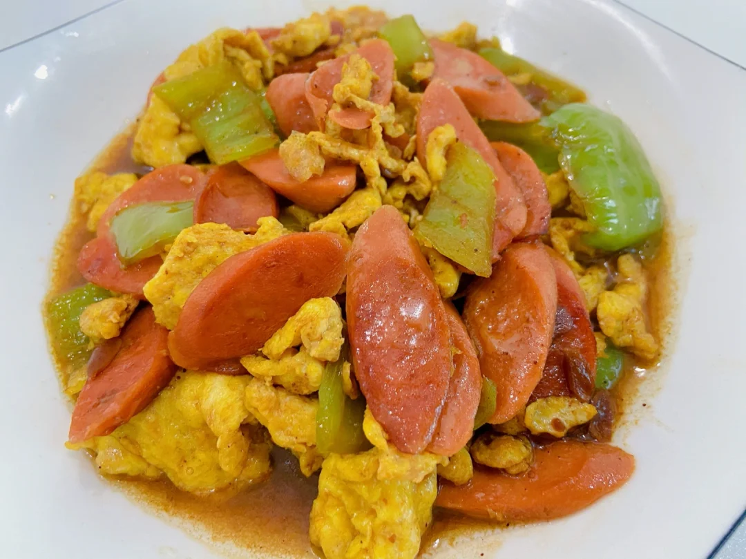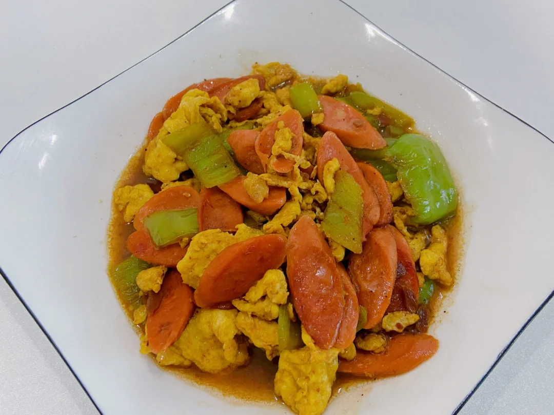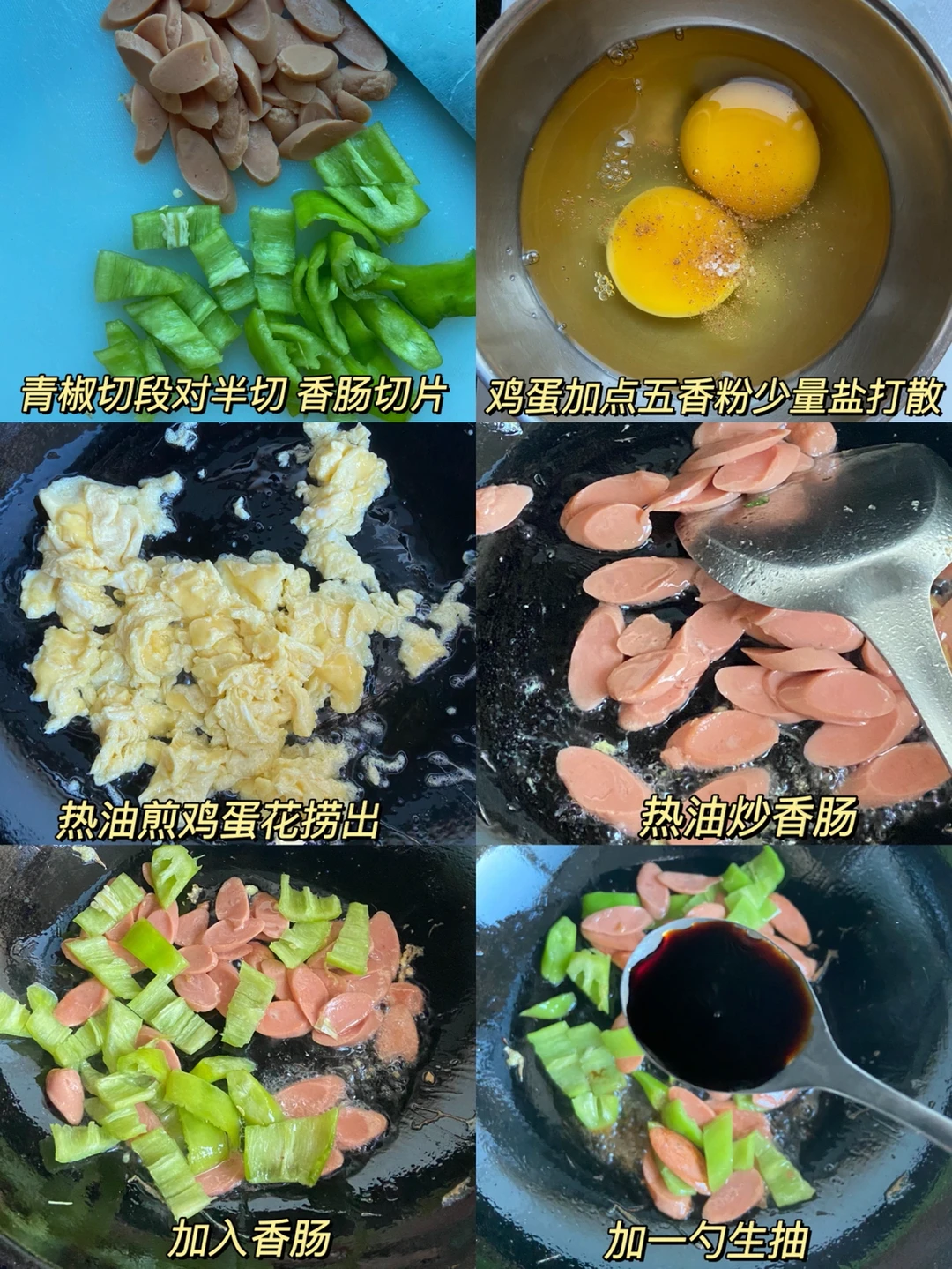 准备食材✨✨✨✨✨ 香肠2根 鸡蛋两颗 青椒一条 做法✨✨✨✨✨ 1️⃣青椒切段对半切 香肠切片 2️⃣鸡蛋加点五香粉少量盐打散 3️⃣热油煎鸡蛋花捞出 4️⃣热油炒香肠 加入青椒 加一勺生抽 加一勺黄豆酱 5️⃣加入鸡蛋花 半勺五香粉 一小勺盐 小半碗水 翻炒均匀即可