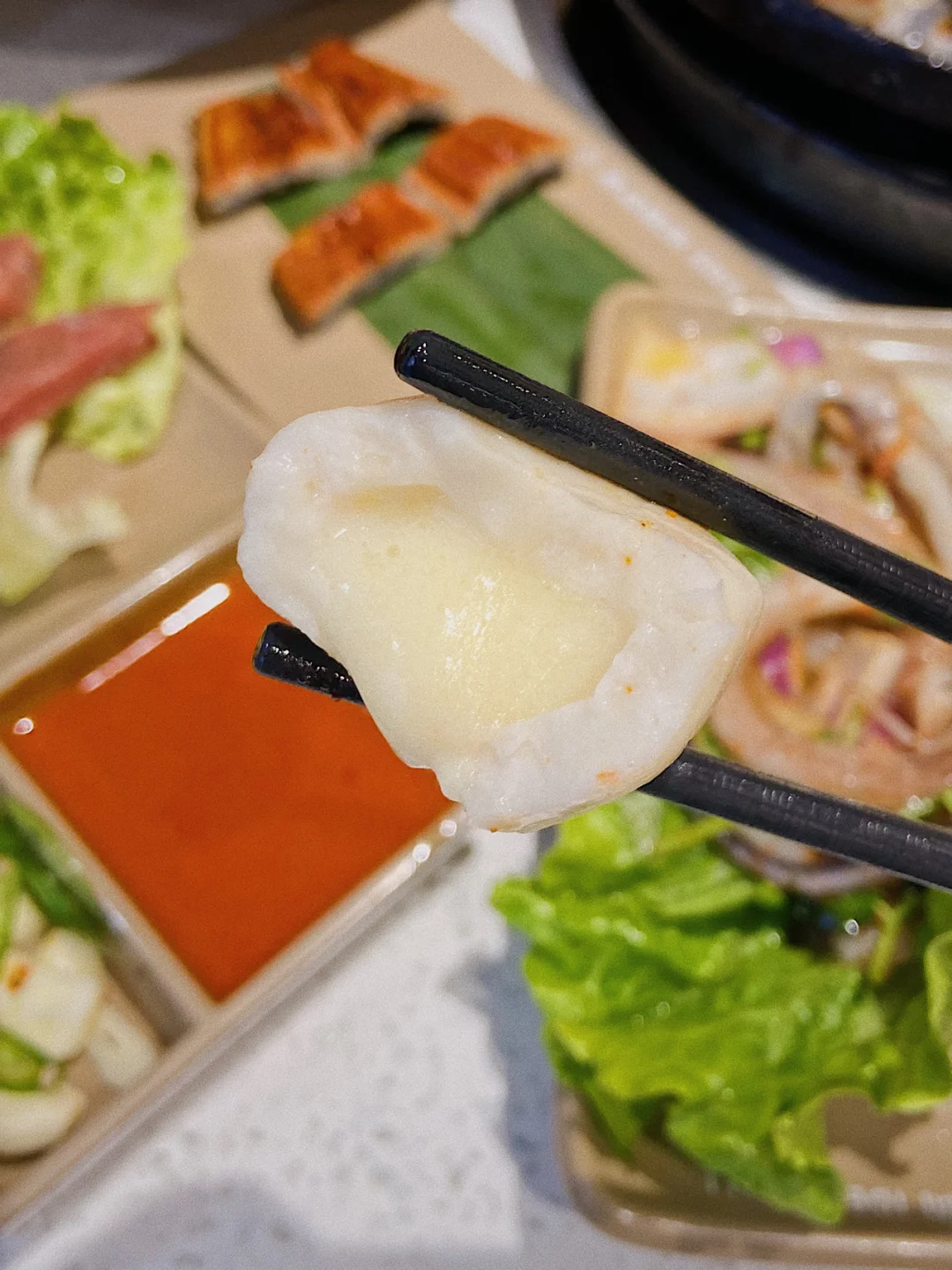 五花肉很新鲜 外焦里嫩 一定要试试蘸酱料配蒜片and青椒!灵魂所在阿!