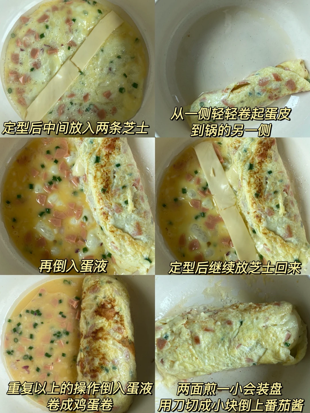 4️⃣从一侧轻轻卷起蛋皮到锅的另一侧 再倒入蛋液 定型后继续放芝士回来