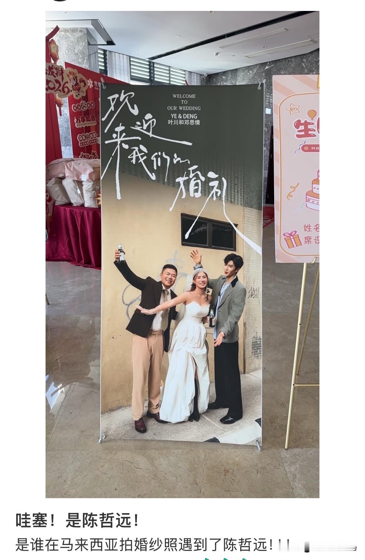 1月12日,陈哲远:三个人的婚纱照 陈哲远马来西亚偶遇拍婚纱照送祝福后续 新郎特意告诉酒店把三人婚纱照放门口迎宾,不仅婚宴当天前来参加婚宴的宾客都看到了这张神图,全网也都看到了这张神图 没人觉得怪异,只觉得羡慕跟开心,给原本幸福快乐的婚宴更增添了许多惊喜色彩 陈哲远人真的很好,这对新人应该会记一辈子吧,同样会喜欢陈哲远一辈子,以后小朋友出生问爸妈,为什么人家爸妈婚纱照是二个人,他爸妈是三个人,好奇他们的回答,哈哈哈哈哈