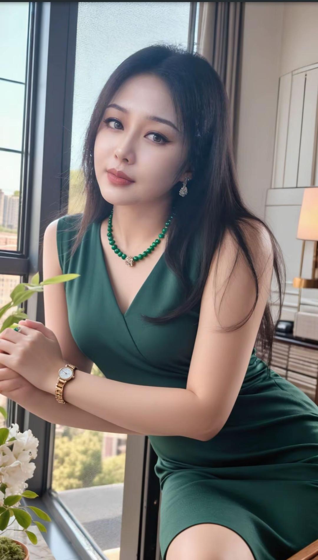 优雅绿裙,精致妆容,阳光洒进来的午后时光。