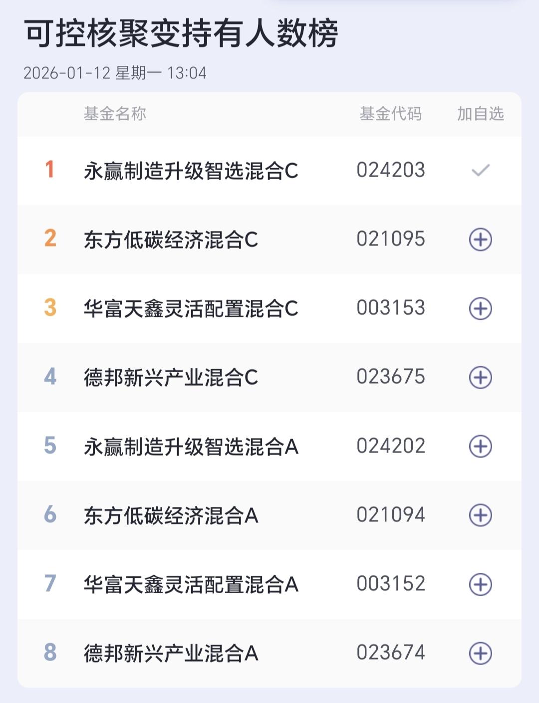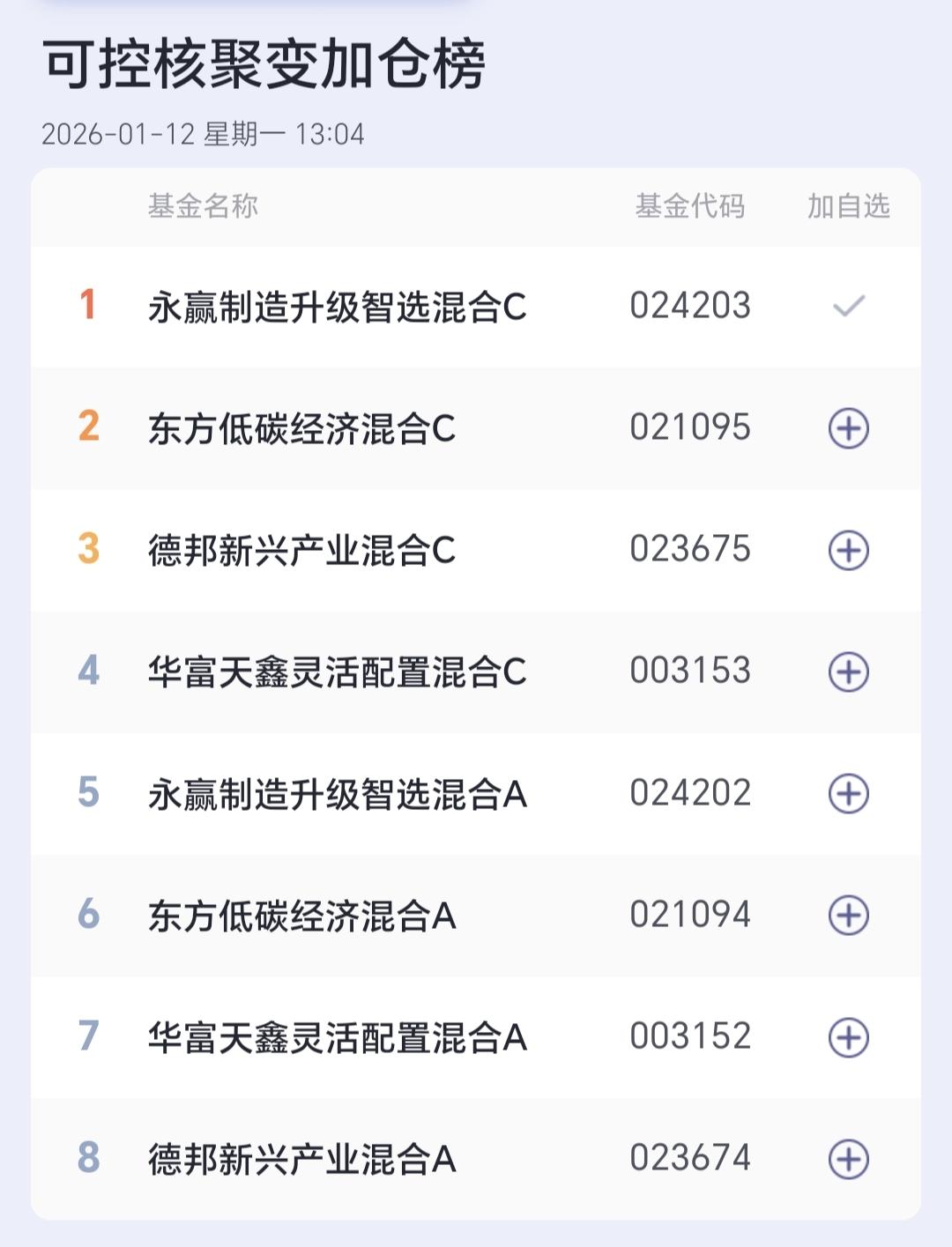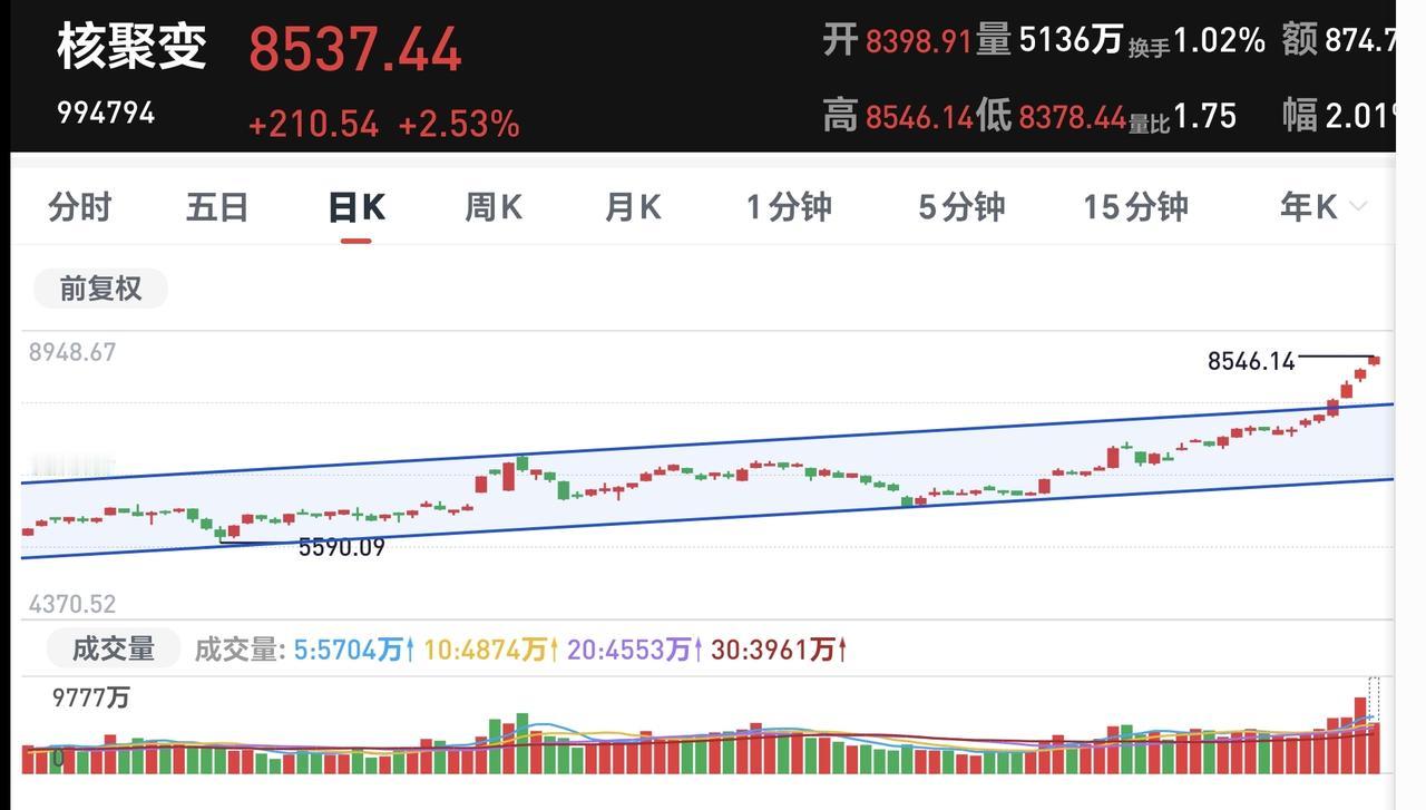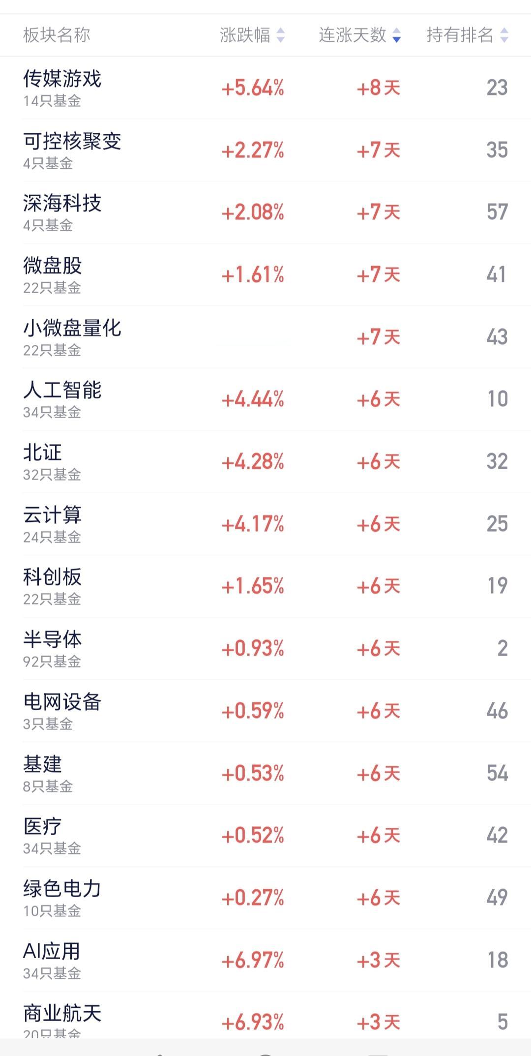 基金:可控核聚变板块应该怎么办 所有的板块中,连续上涨8天的板块是传媒游戏板块,连续上涨7天的板块有4只,连续上涨6天的板块有9只,见下面的截图1,可控核聚变板块连续上涨了7个交易日,今天又是上涨,盘中估值上涨了2.26%,持有人数在所有的板块中排名第35位。 这个板块加仓排行榜见下面的截图3,持有人数排行榜见下面的截图4,排名第一的都是永赢制造升级智选混合,我每天定投10块钱在进行观察。 我们来看一下下面的截图5,这是核聚变板块日K线图,从图中可以看出,我画了两条倾斜向上的斜线,这是核聚变板块日线级别上涨通道,上周的上涨突破了这个上涨通道的上轨,进入了加速上涨的状态。 我们来看一下下面的截图6,这是核聚变板块周K线图,从图中可以看出,我画了两条倾斜向上的斜线,这是核聚变板块周线级别上涨通道,上周上涨突破了这个上涨通道的上轨,本周继续上涨,周线级别也有可能进入了加速上涨的状态。 由于这个板块是进入了加速上涨的状态,日线级别和周线级别都是进入加速上涨的状态,所以,我每天定投10块钱,并不是已经进场了这只基金,而只是在进行观察,看看后面有没有合适的进场机会,进场机会是可遇不可求的,不可以为了进场而进场。 我每天都会分享我的观点,我的观点只代表我个人的看法,不能作为你操作的依据,据此操作后果自负。